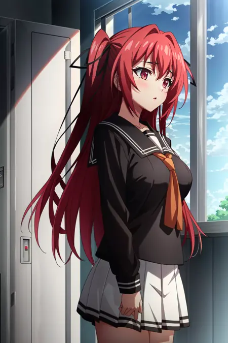 나루세 미오, 1소녀, 혼자, 허벅지 긴 양말, 빨간 머리, 학교 유니폼, 긴 머리, 리본, 치마, 머리 리본, 검은 허벅지 긴 양말, 붉은 눈, 미소, 젯타이 류오키, 전체 몸, 양쪽 올려매기, 큰 가슴, 가슴, 세라후쿠, 주름 치마
