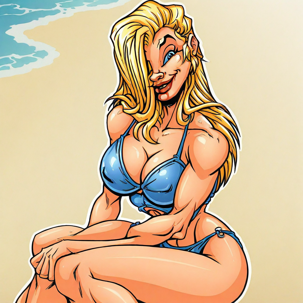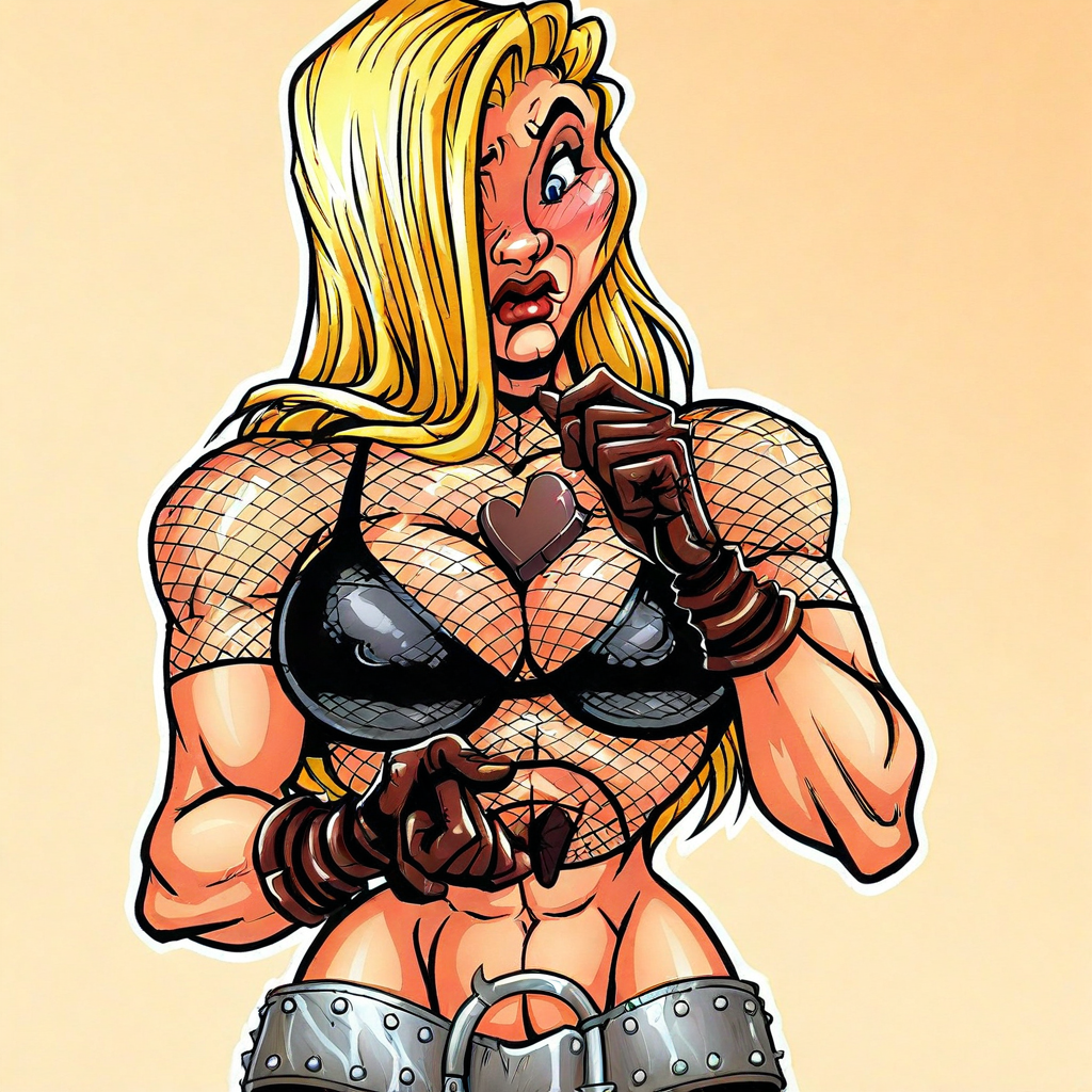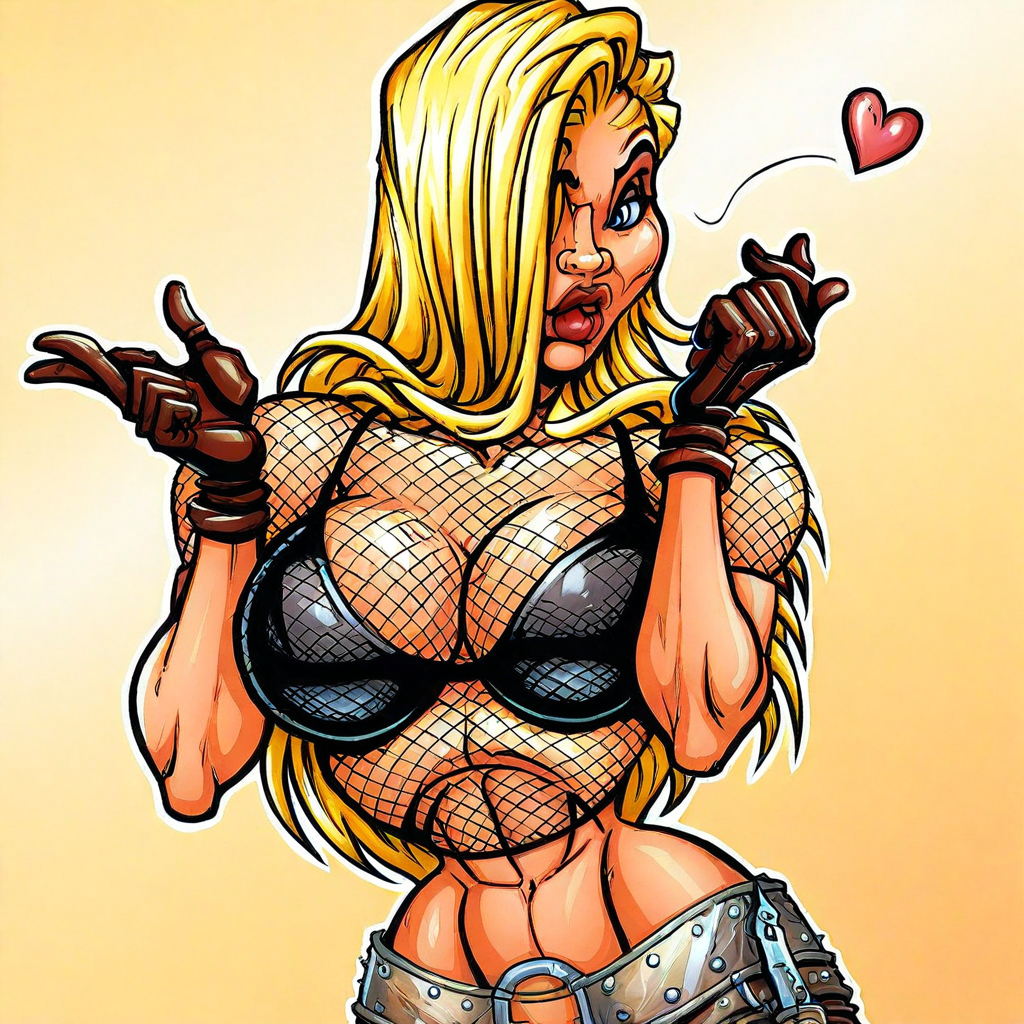 natalia kassle \(danger girl\), blonde hair, long hair, hair over one eye, blue eyes, red lipstick, black bikini top, fishnets, gloves, pants, belt, heels, large breasts, 1girl, solo