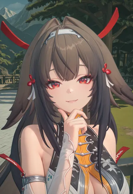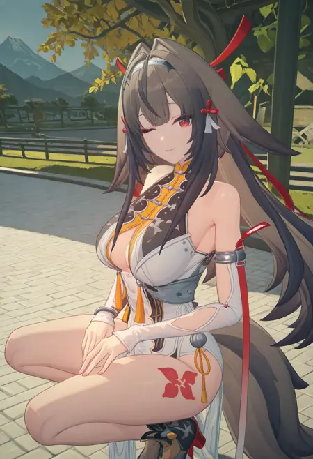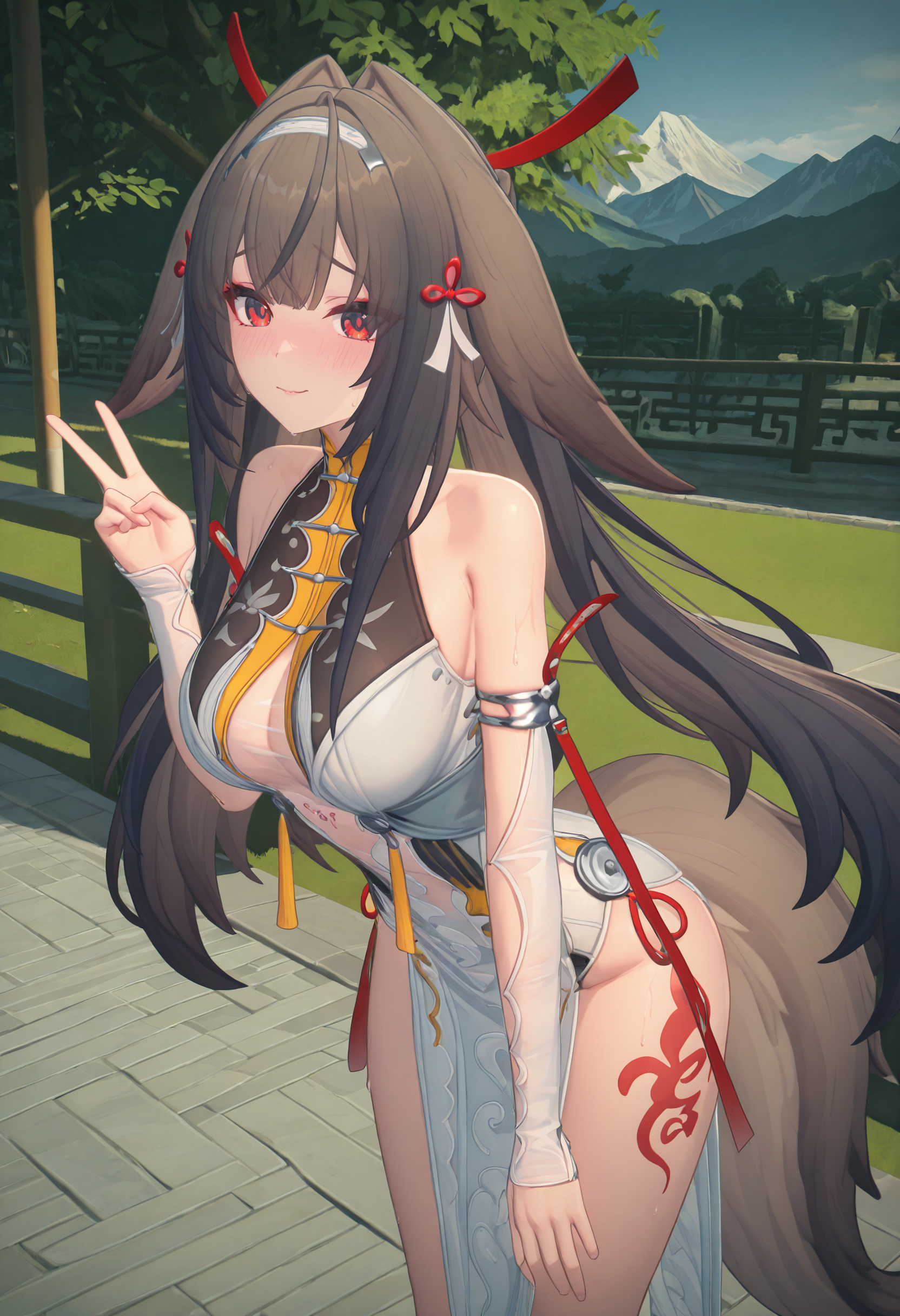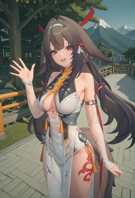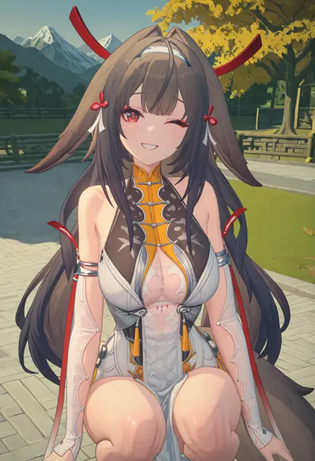 | トレーニングワード | Zenless zone zero style, 1girl, Ye Shunguang, solo, long furry ears, brown hair, long hair, white hairband, bangs, long siderburns, red hairpins, red tassels, white tassels, red eyes, red pupils,コピーしました! white qipao, open qipao, gold trim, low cleavage, see-through low cleavage, black trim, long pelvic curtain, pelvic curtain pattern, sheer sleeves, detached sleeves, sheer bodysuit, high cut, red thigh tattoo, long tail, bare legs,コピーしました! |