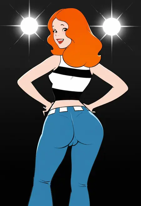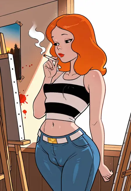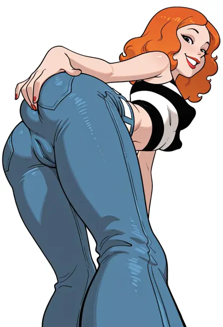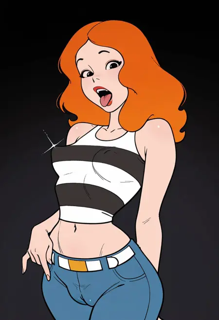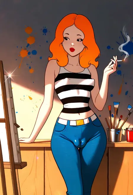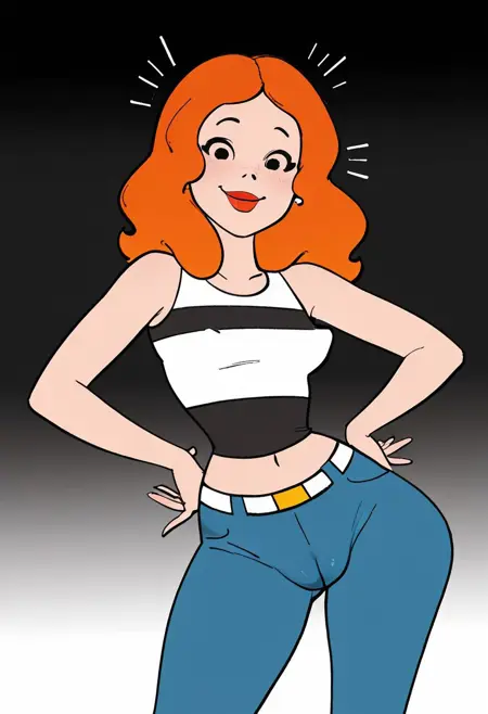 hnnh, 1girl, solo, ginger hair, lipstick, slim, very perky breasts, narrow waist, curvy hips, stripy camisole {{black and white stripes}}, white belt, denim flares, bare midriff, cameltoe {{pussy bulge}},