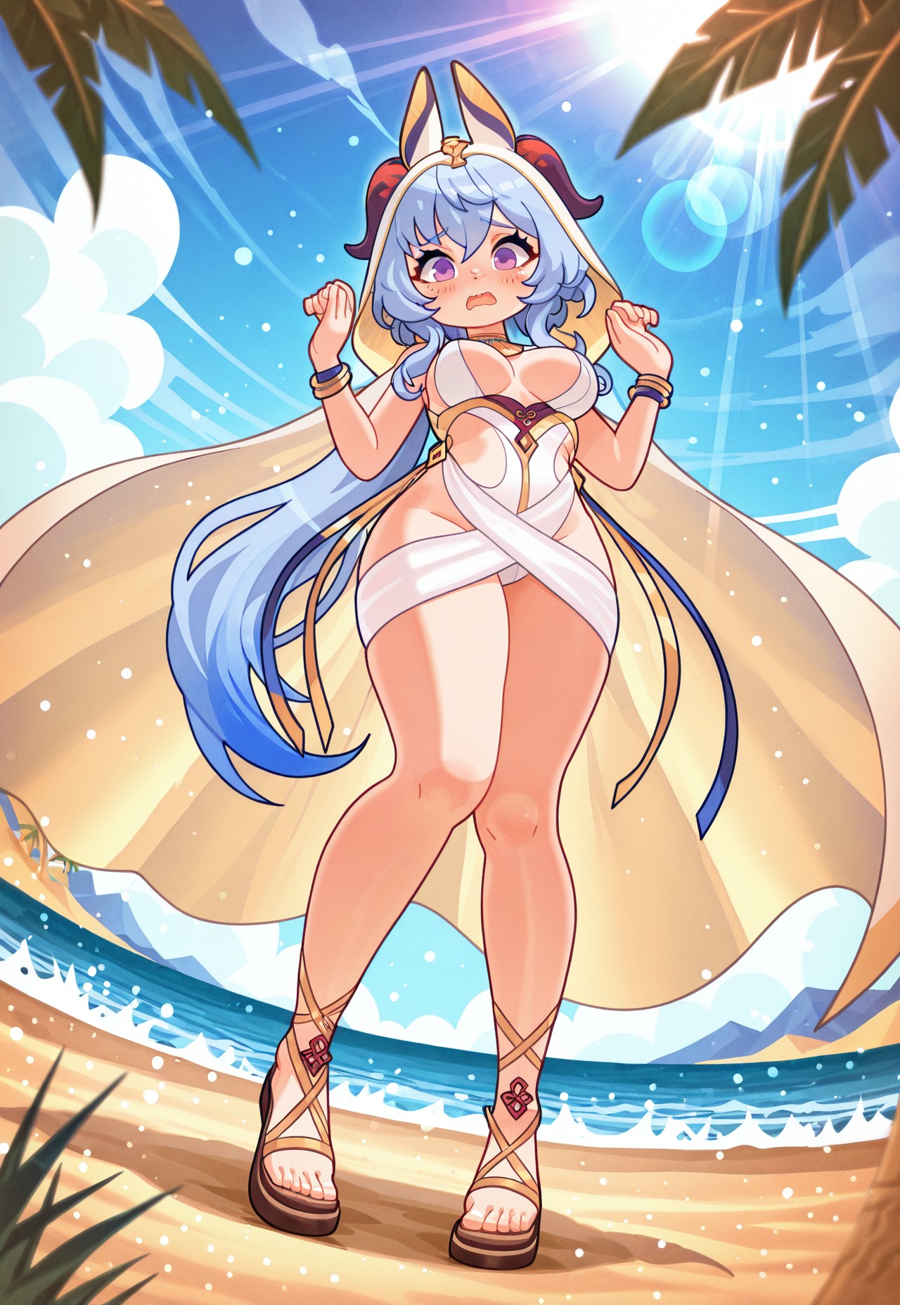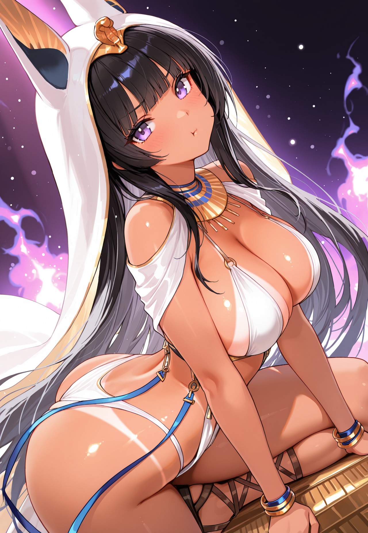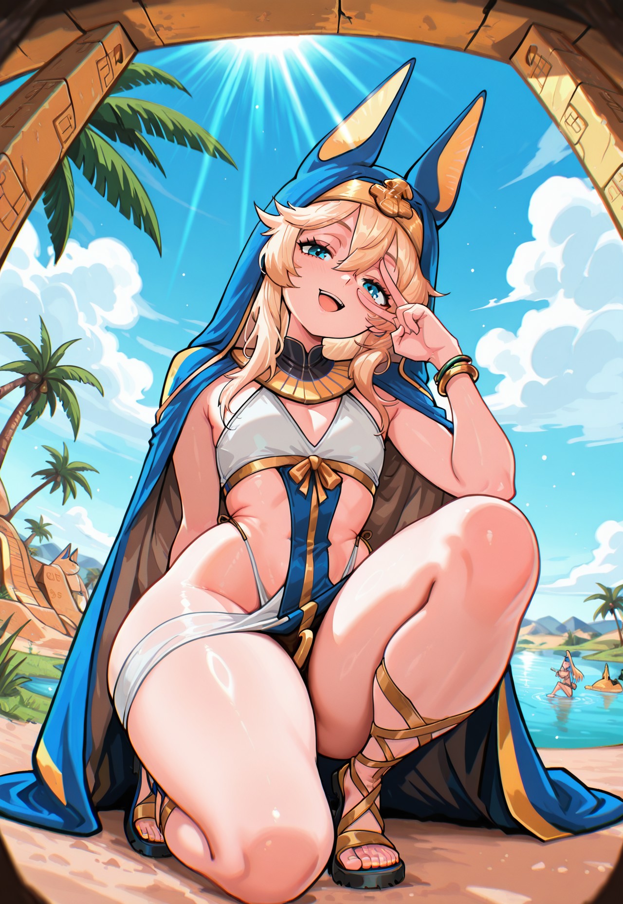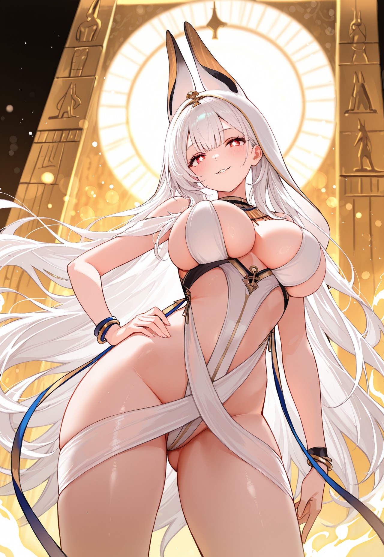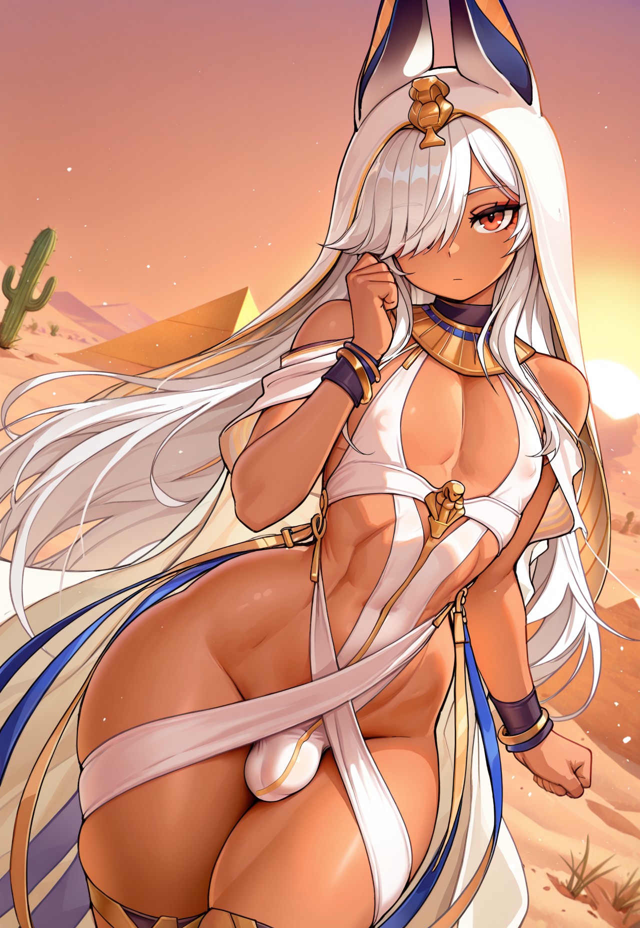 samjac,hood up,jackal hood,white ancient egyptian clothes,revealing clothes,usekh collar,gold bracelet,hair ornament,gladiator sandals,