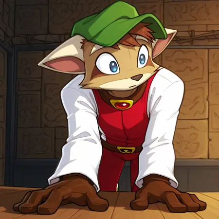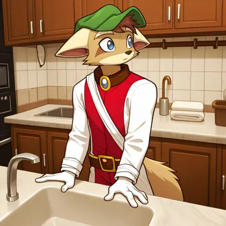 Uniform - white shirt, red vest, gloves, red gloves, white pants, cast, belt