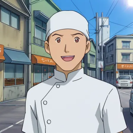 衣装1:男性、茶色の髪、白いバンダナ、茶色の目、シェフのユニフォーム、ウエストエプロン、ターン色のズボン、緑色の靴