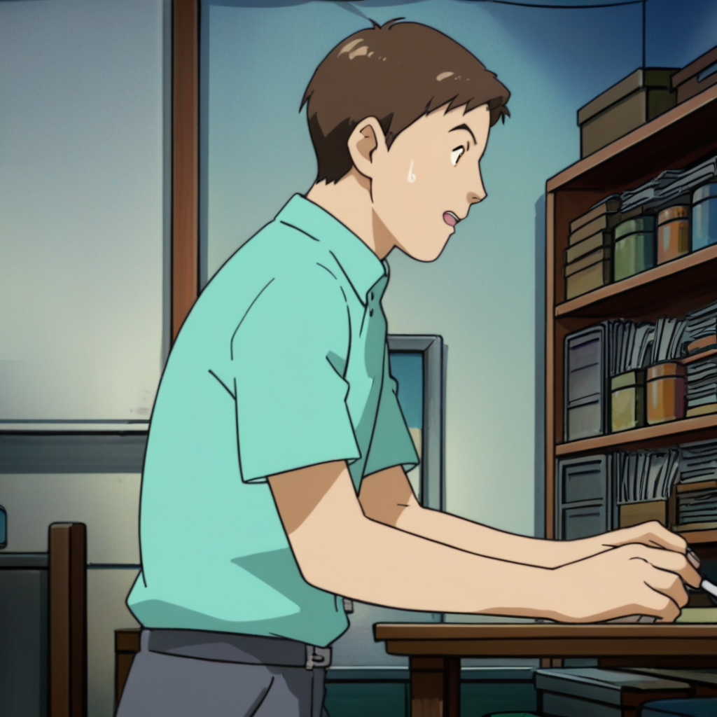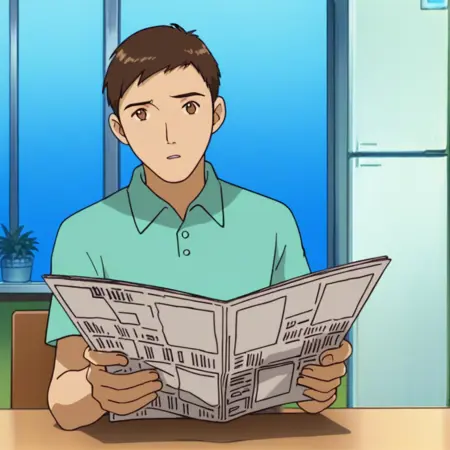 衣装2:男性、茶色の髪、茶色の目、ターコイズ色のシャツ(襟付き)、短袖、灰色のズボン、素足