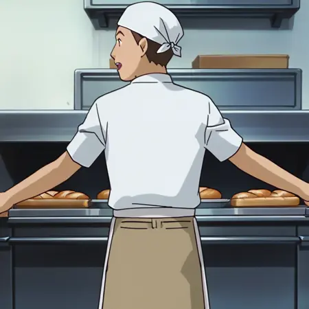 背景:屋内(ベーカリー/棚が満載/パン棚/パン/バスケット/絵画(オブジェクト)/エアコン/カウンター)、屋内(キッチン/オーブン/オーブンの中のパン/テーブル/散らかった状態/時計)、屋内(ダイニングルーム/タイル壁/タイル床/ダイニングテーブル/ダイニングチェア/冷蔵庫/テレビ/カーテン/窓/鉢植え)、屋外(街/空/雲/店舗/看板/建物/電柱/電線/街灯/茂み/車)