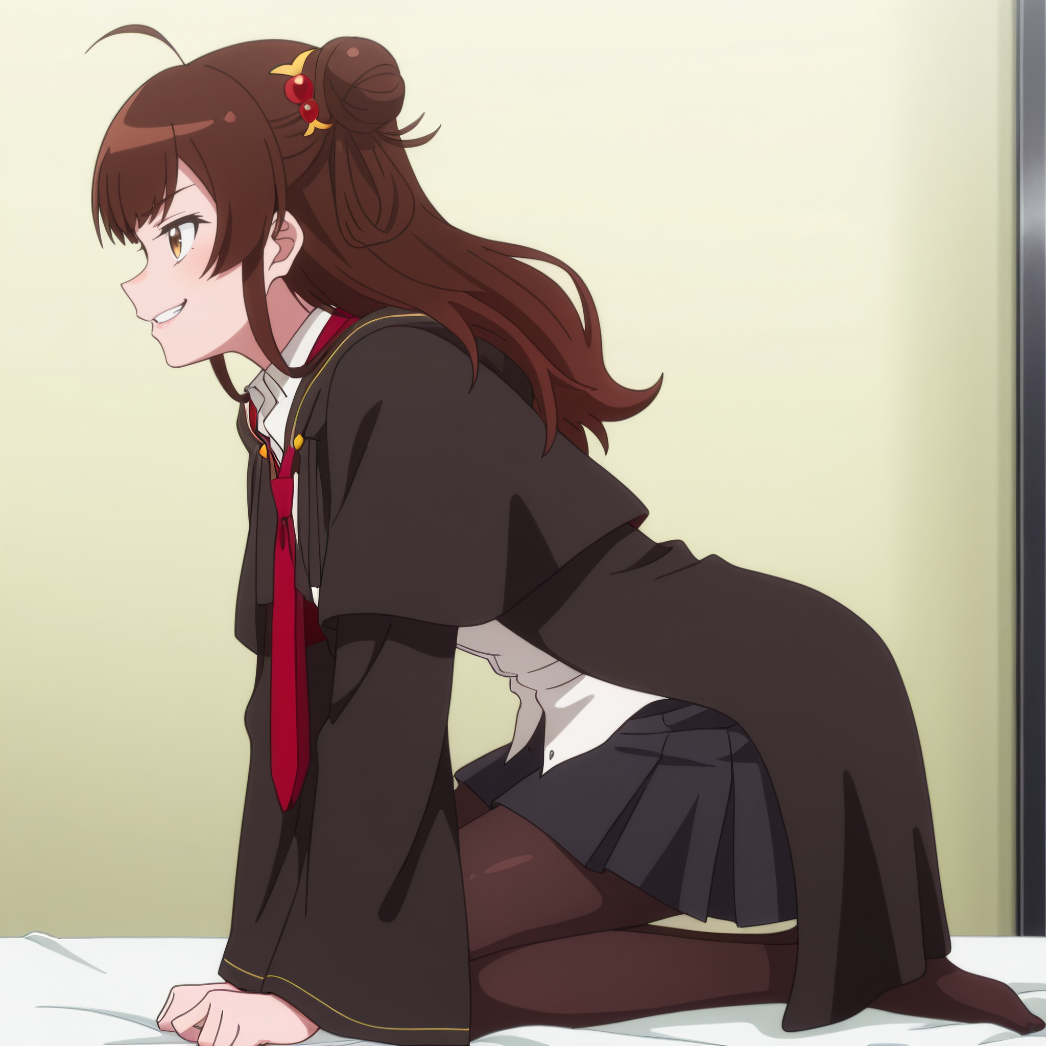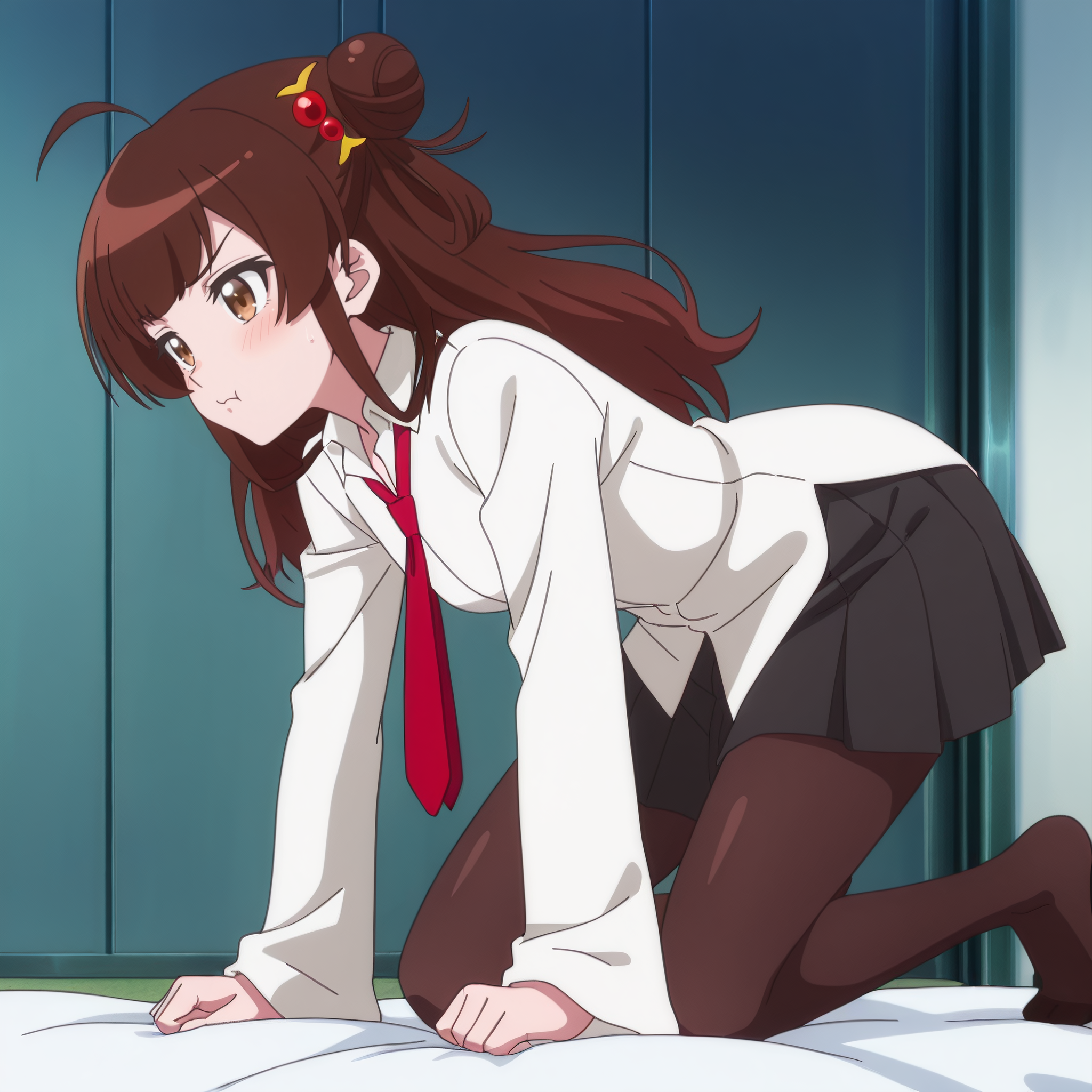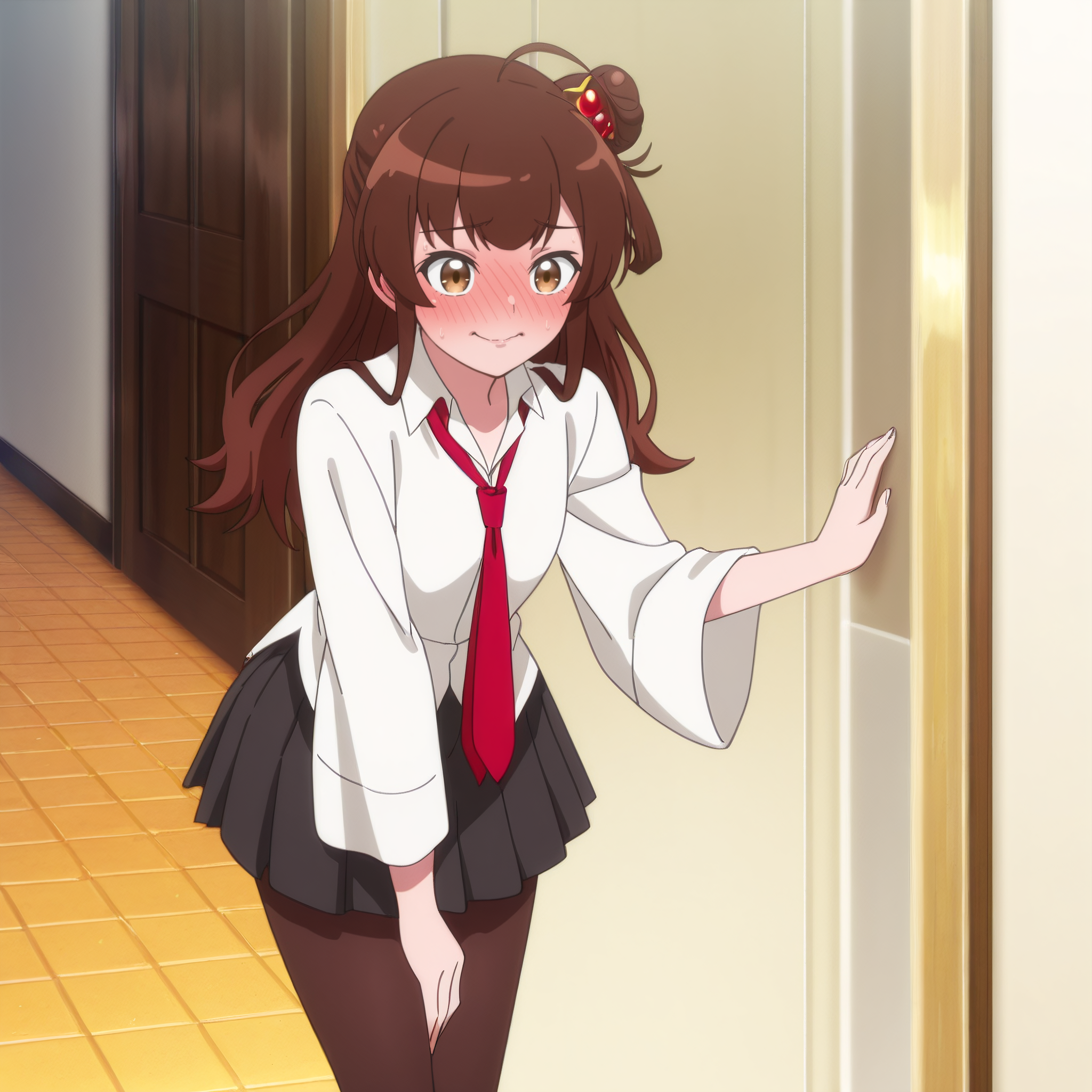 MegOutfit、シャツ、白いシャツ、髪飾り、ネクタイ、衿付きシャツ、赤いネクタイ、学ラン、長袖、スカート、タイツ、プリーツスカート、黒いスカート、ワイングカラー、広い袖、黒いレッグウェア、