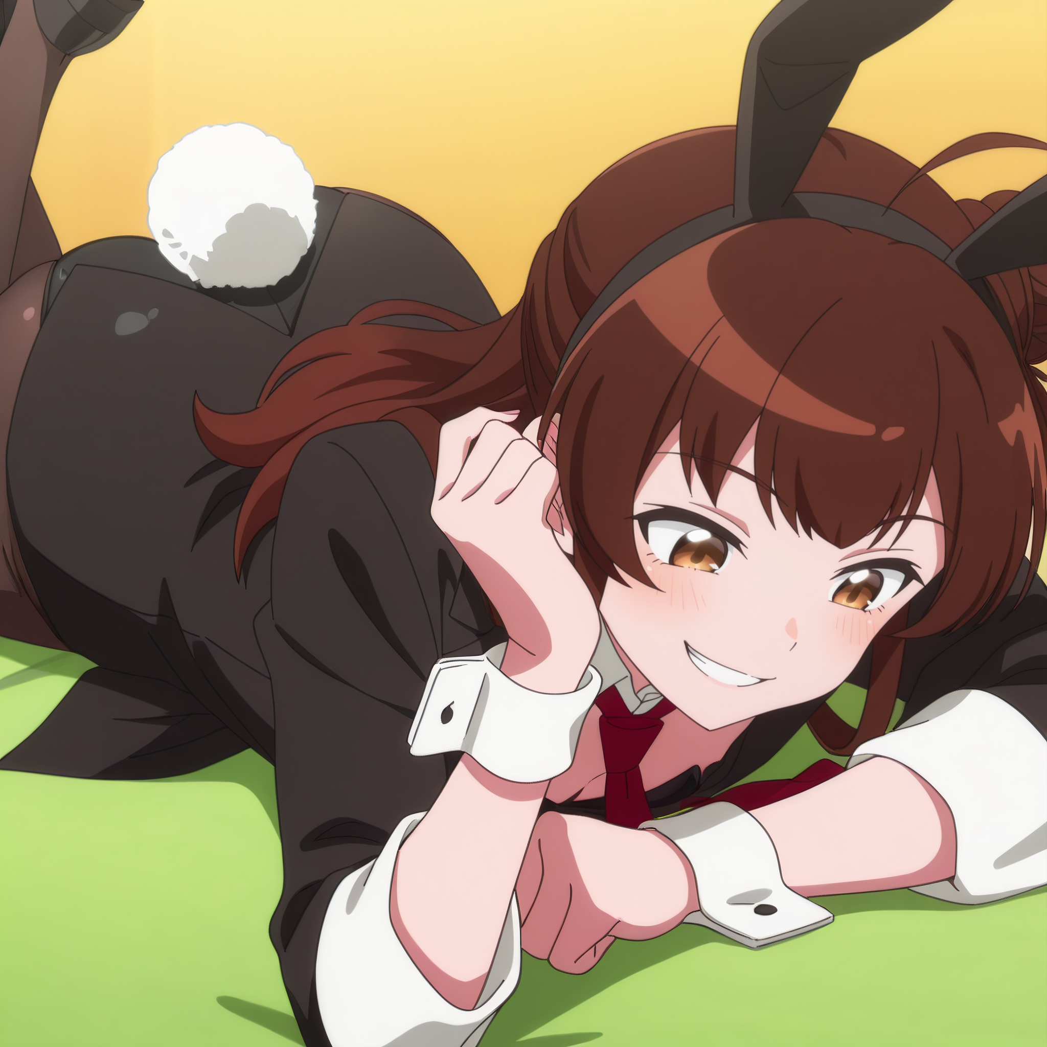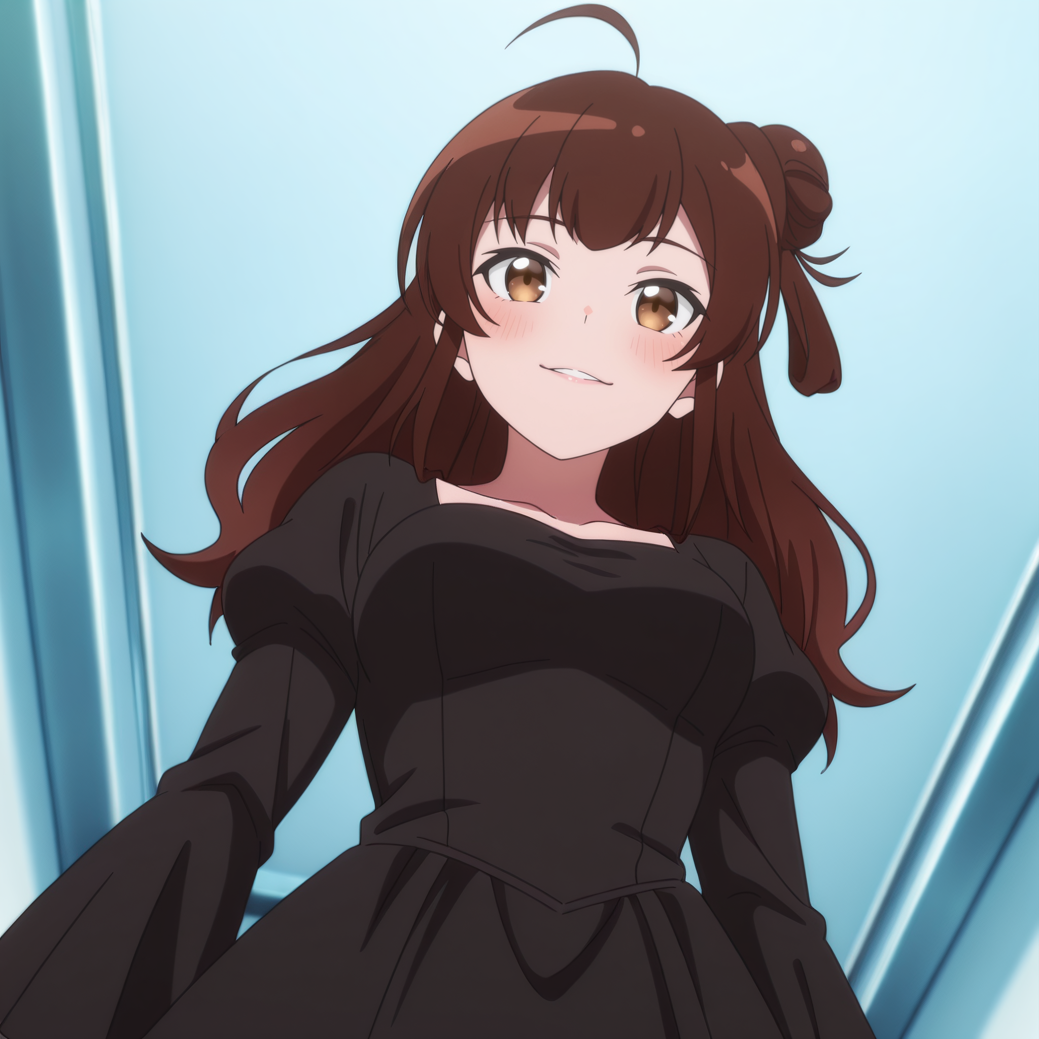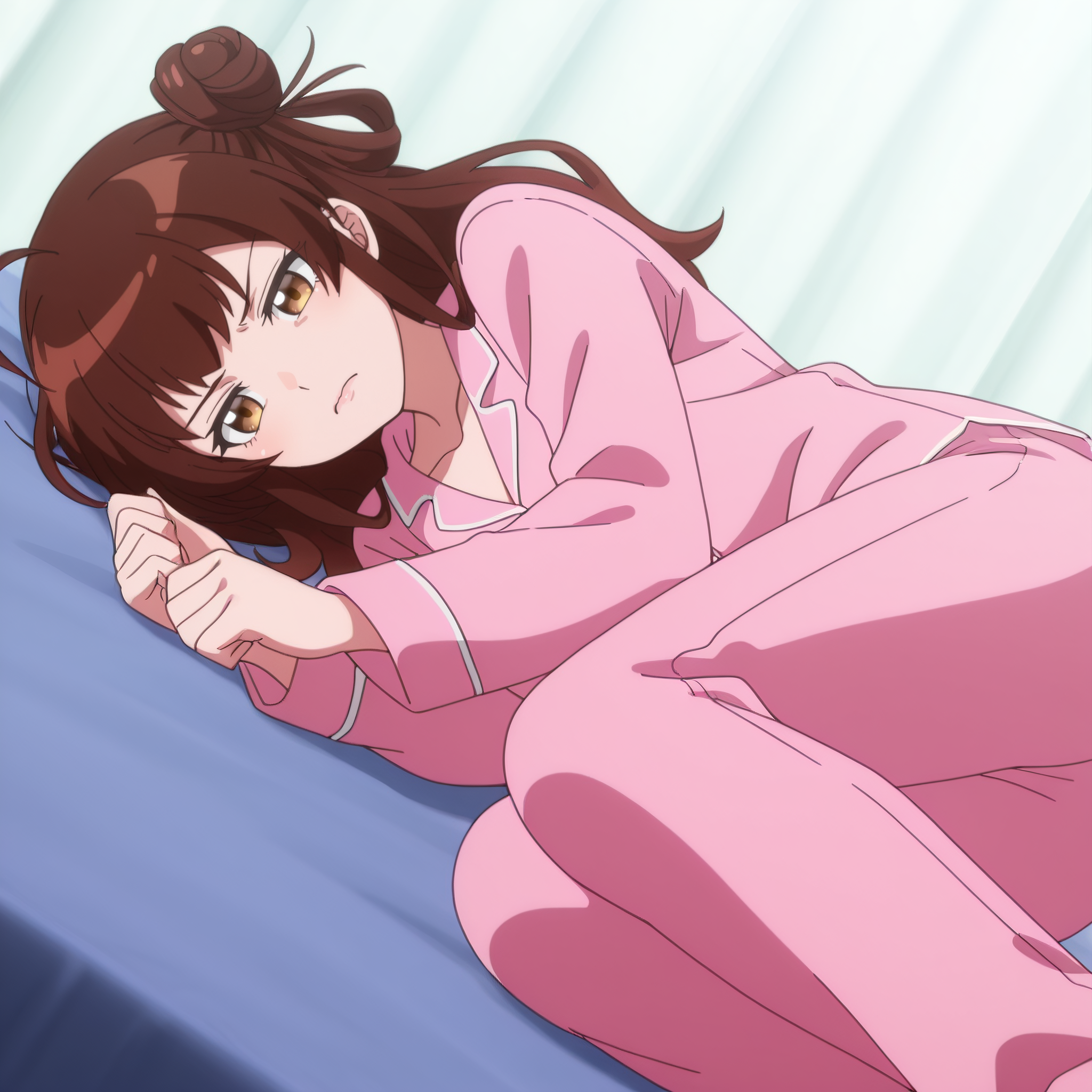 AMGMeg、茶色の髪、長い髪、前髪、茶色の目、髪の下に見える眉毛、あほ毛、髪の結び目、横結び目、