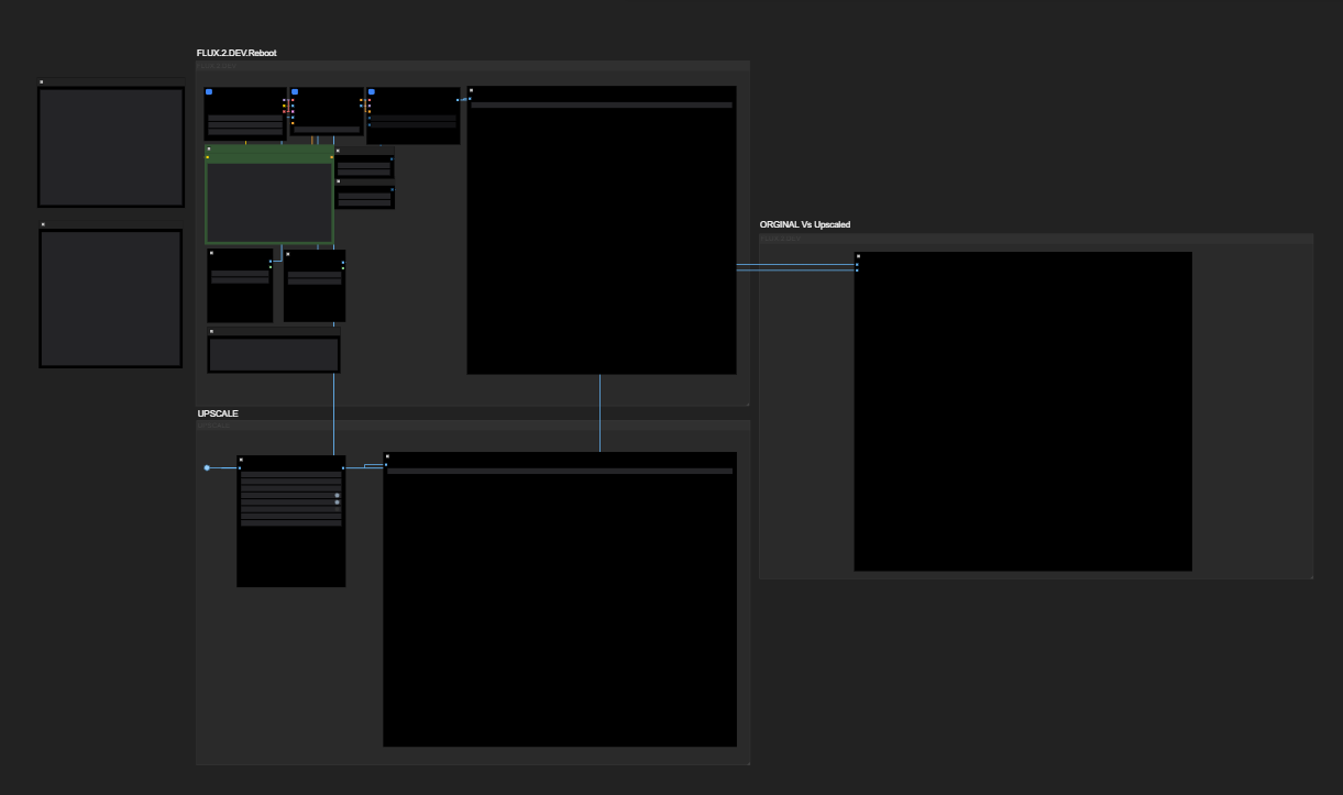 FLUX.2-dev Reboot用のミニマルで極めてクリーンなComfyUIワークフロー。FlashVSRアップスケーラーとオリジナル vs アップスケールの比較パネルを組み合わせ、高速でプロフェッショナルな画像生成を実現します。