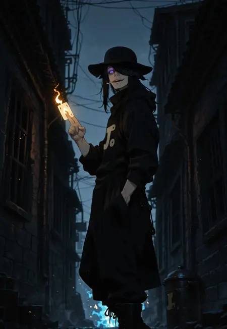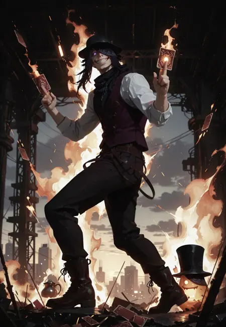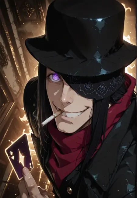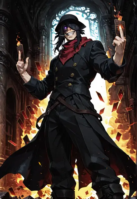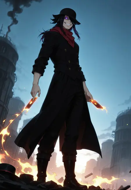vest, shirt, trousers, boots, white ascot tie, long black coat, eyepatch, red scarf, top hat, (black bandana, pattern on bandana), baggy clothes,
