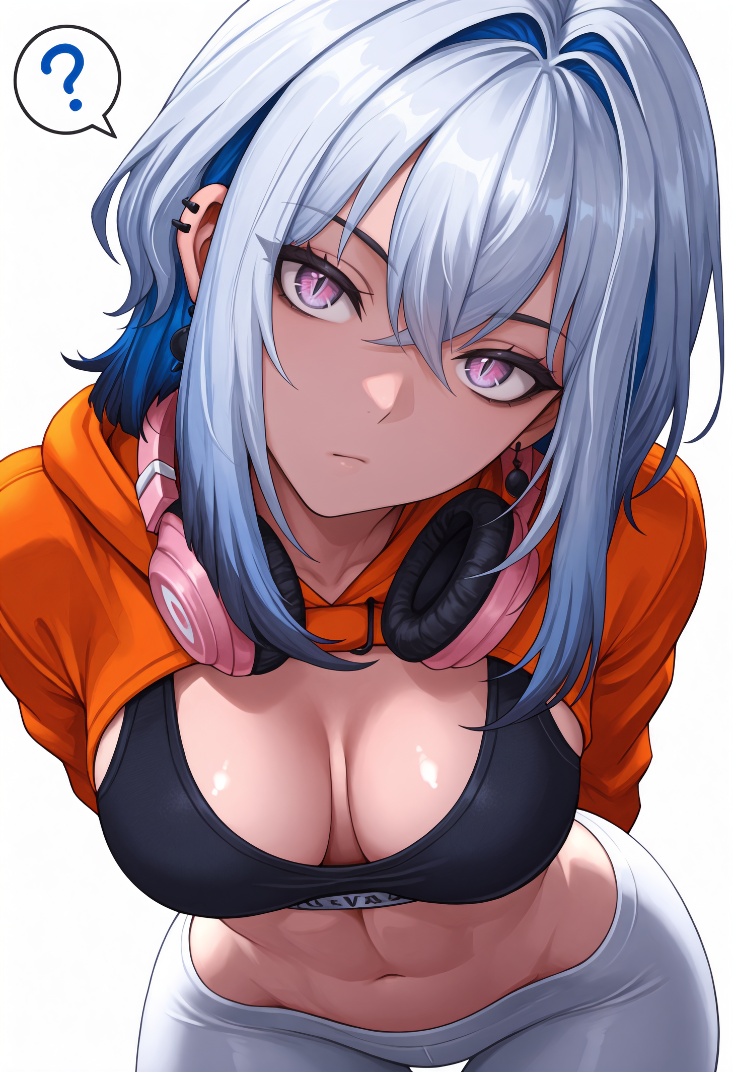 代替外観にもこちらを使用: "黄色の目、紫の目、縦に細長い瞳孔、多色の目、白髪、オレンジ髪、内側の髪に色付き、多色の髪、髪の毛が目に入っている、目の間の髪、交差した前髪、サイドロックス、ミディアムヘア、耳 piercing、黒いイヤリング、垂れ下がるイヤリング、首のほくろ、色付きの手、オレンジ色の四肢"