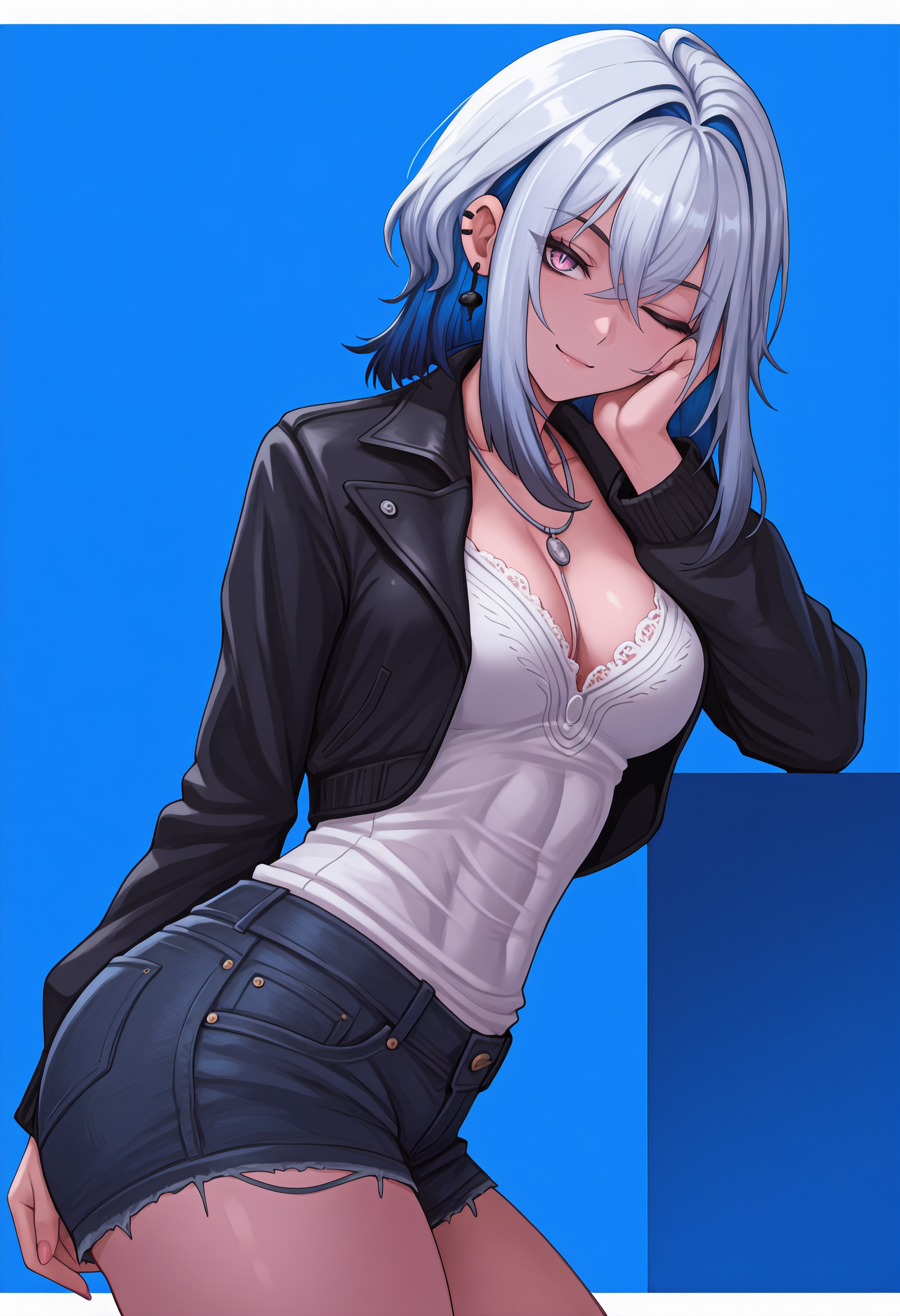 常に必要: "紫の目、縦に細長い瞳孔、多色の目、白髪、青髪、内側の髪に色付き、多色の髪、髪の毛が目に入っている、目の間の髪、交差した前髪、サイドロックス、ミディアムヘア、耳 piercing、黒いイヤリング、垂れ下がるイヤリング、首のほくろ" は常に必須です。