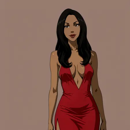 触发词:LunaBoondocks, 1girl, 中等胸部, 乳沟, 珠宝, 连衣裙, 口红, 手镯, 长发, 黑发, 妆容, 棕色眼睛, 深色皮肤女性, 深色皮肤