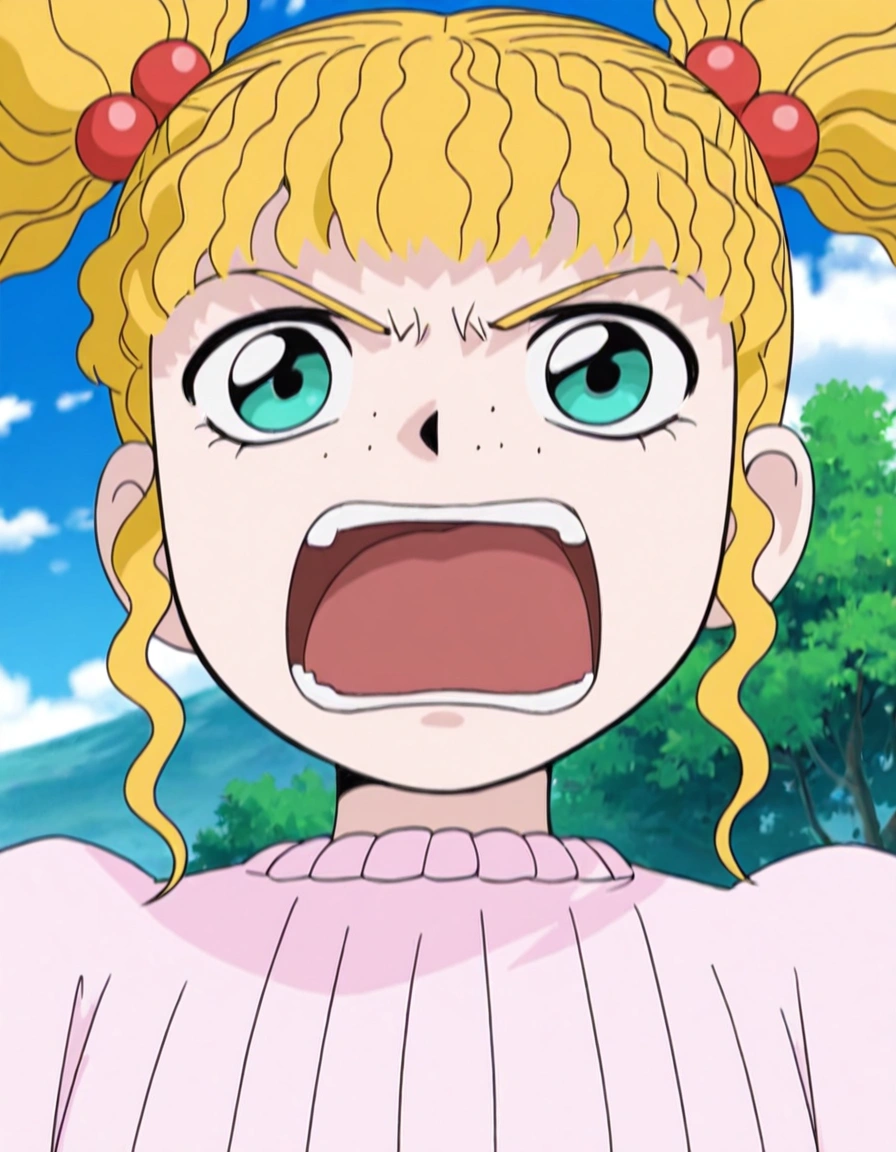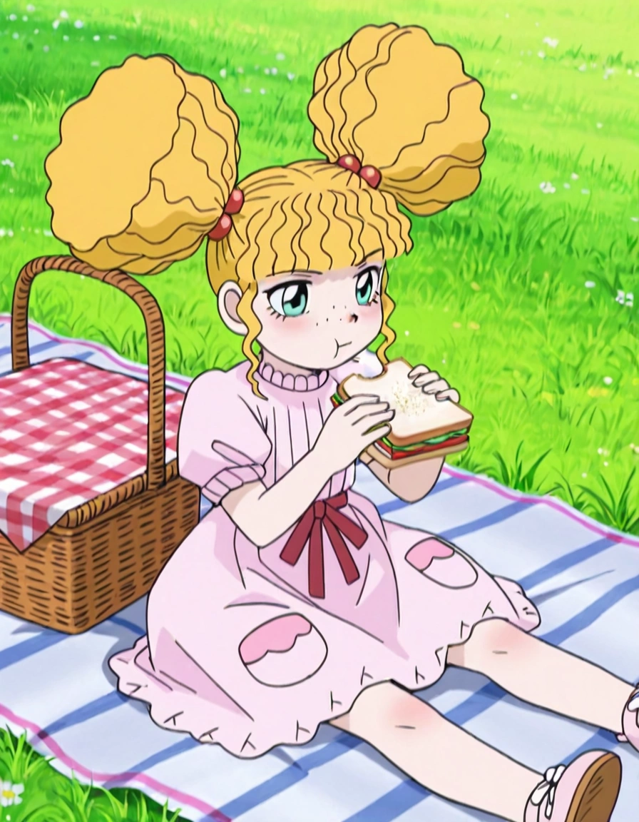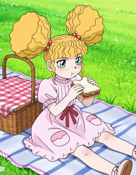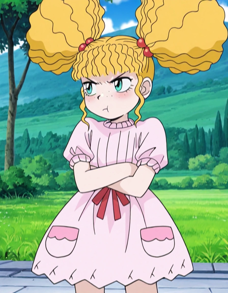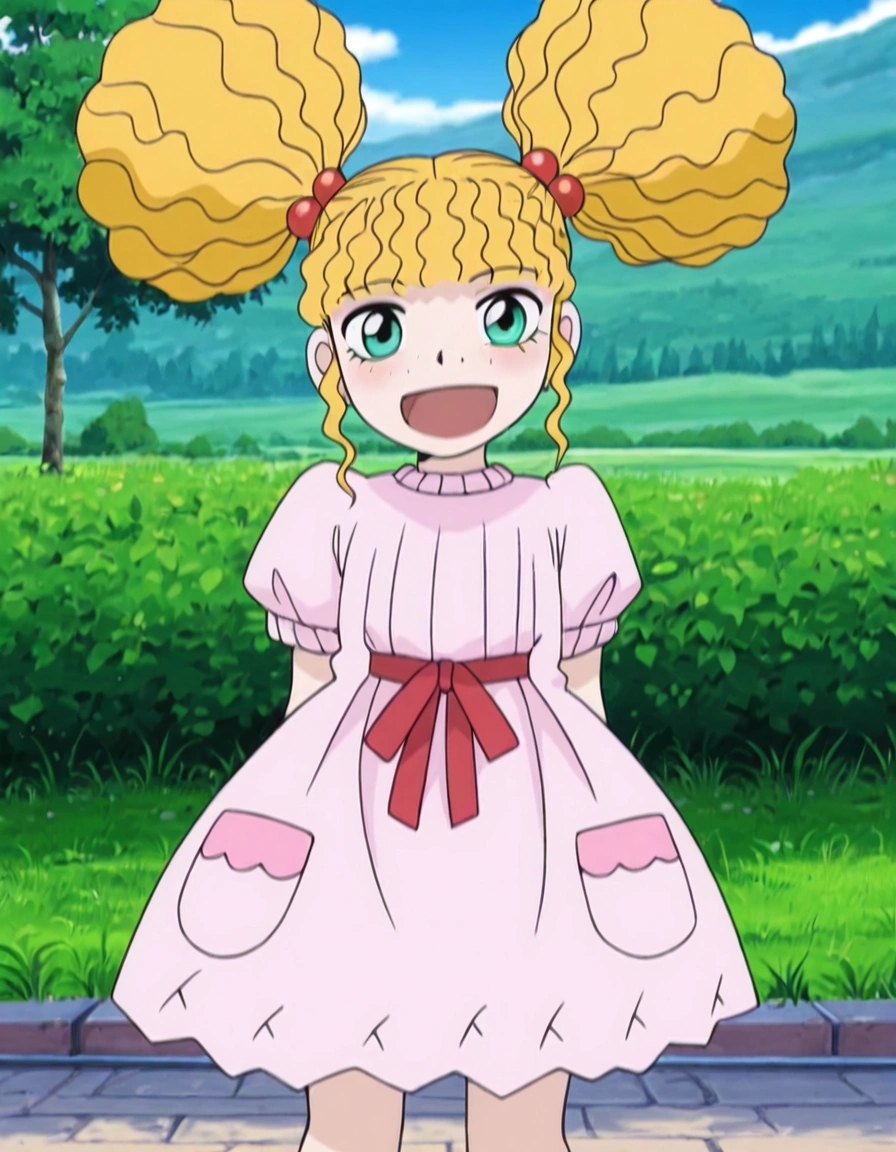 训练提示:jem, jemchan, 金发,卷发,双马尾,红色发圈,卷刘海,青绿色眼睛,雀斑,粉色裙子,
