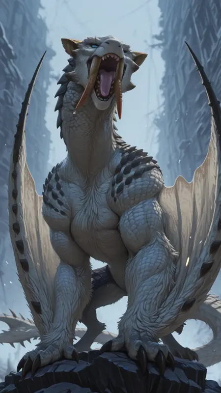 Barioth, wyvern, winged arms, saber fangs, claws, tail, spikes, fur mane,
