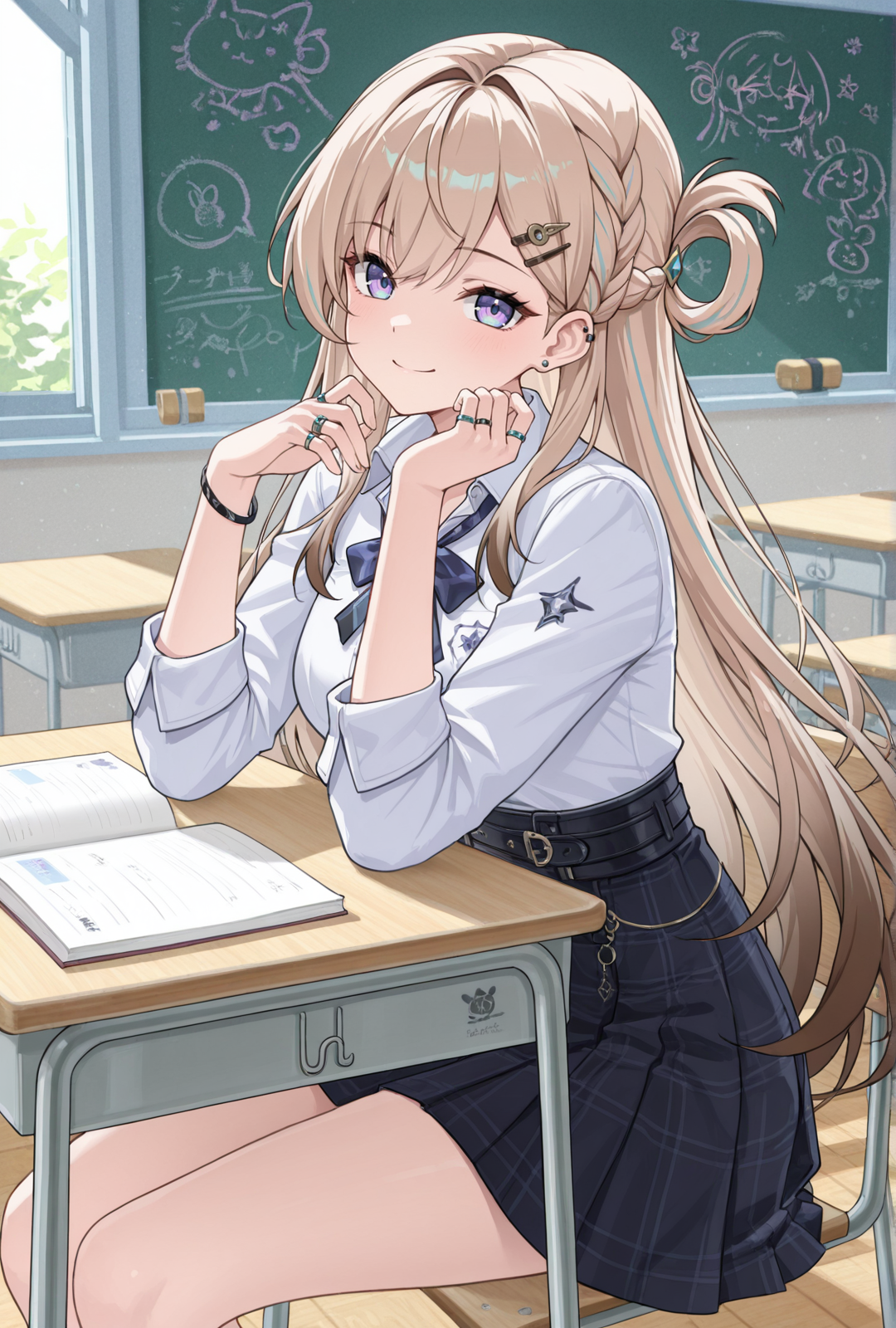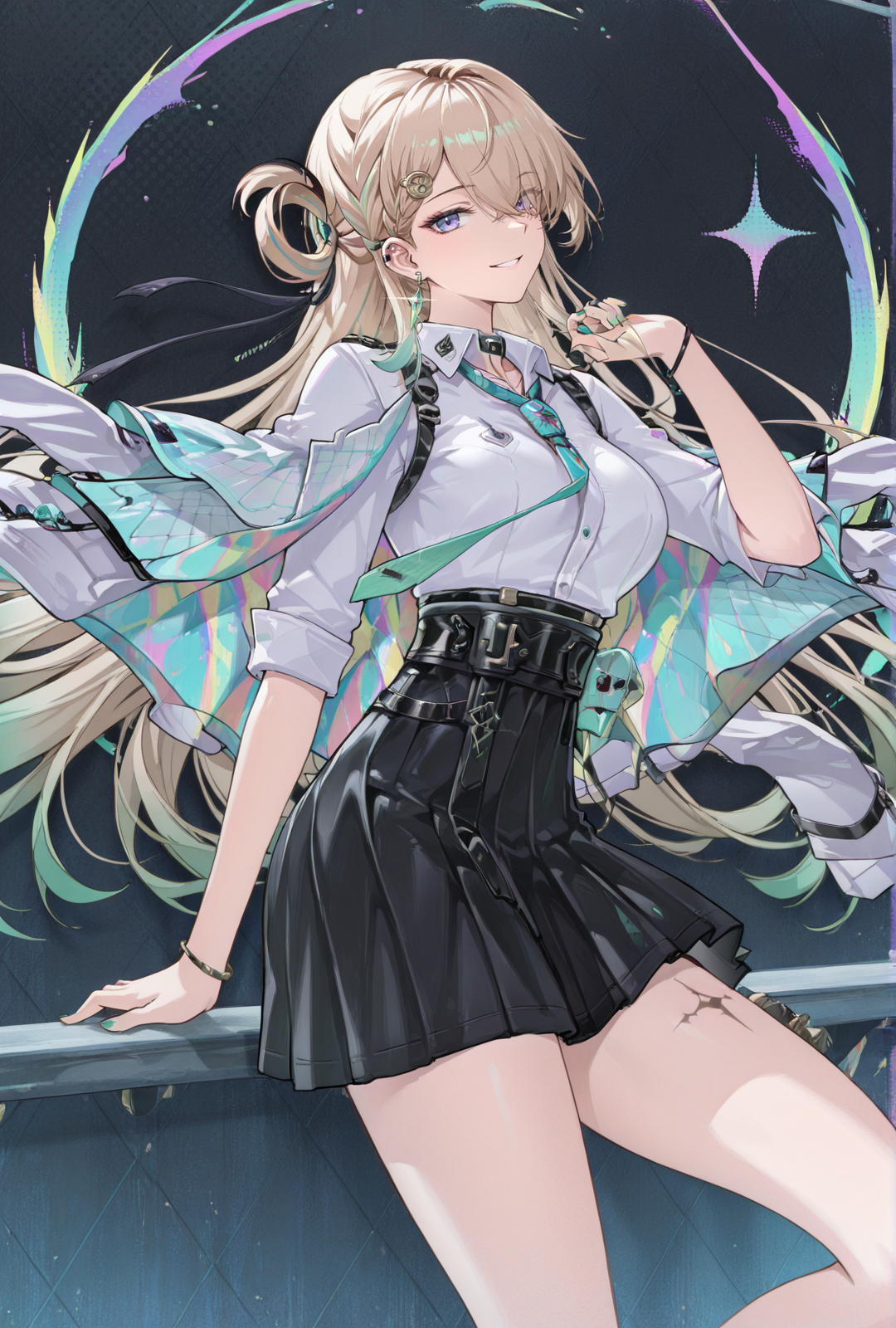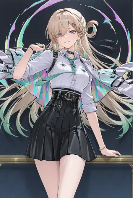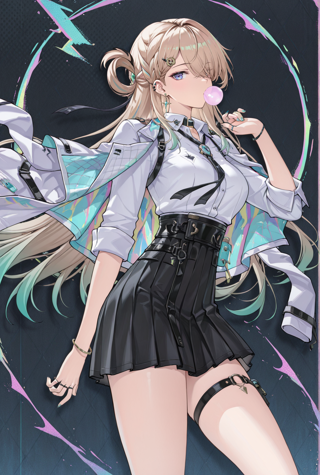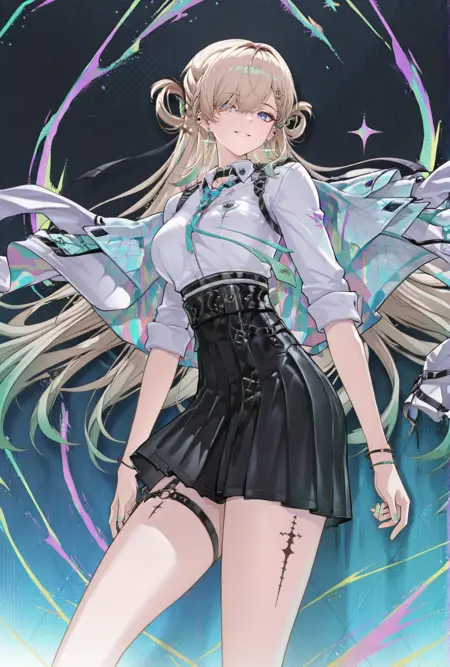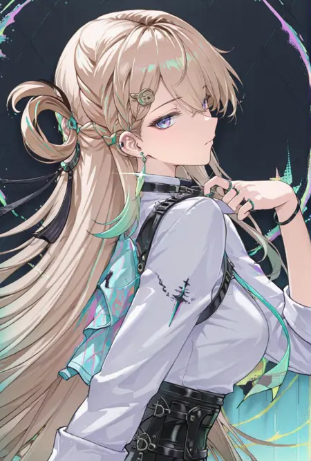 | 학습된 단어 | Lynae, 1girl, solo, long hair, blue eyes, purple eyes, multicolored hair, gradient hair, light brown hair, blonde hair, hair over one eye, half updo, hair rings복사됨! french braid, hair ornament, white shirt, earrings, pleated skirt, necktie, belt, black skirt, nail polish, bracelet, piercing, white jacket, ear piercing, sleeves rolled up, high-waist skirt, jacket on shoulders, green nails, aqua nails, hair ribbon, shirt tucked in, two-sided fabric복사됨! |