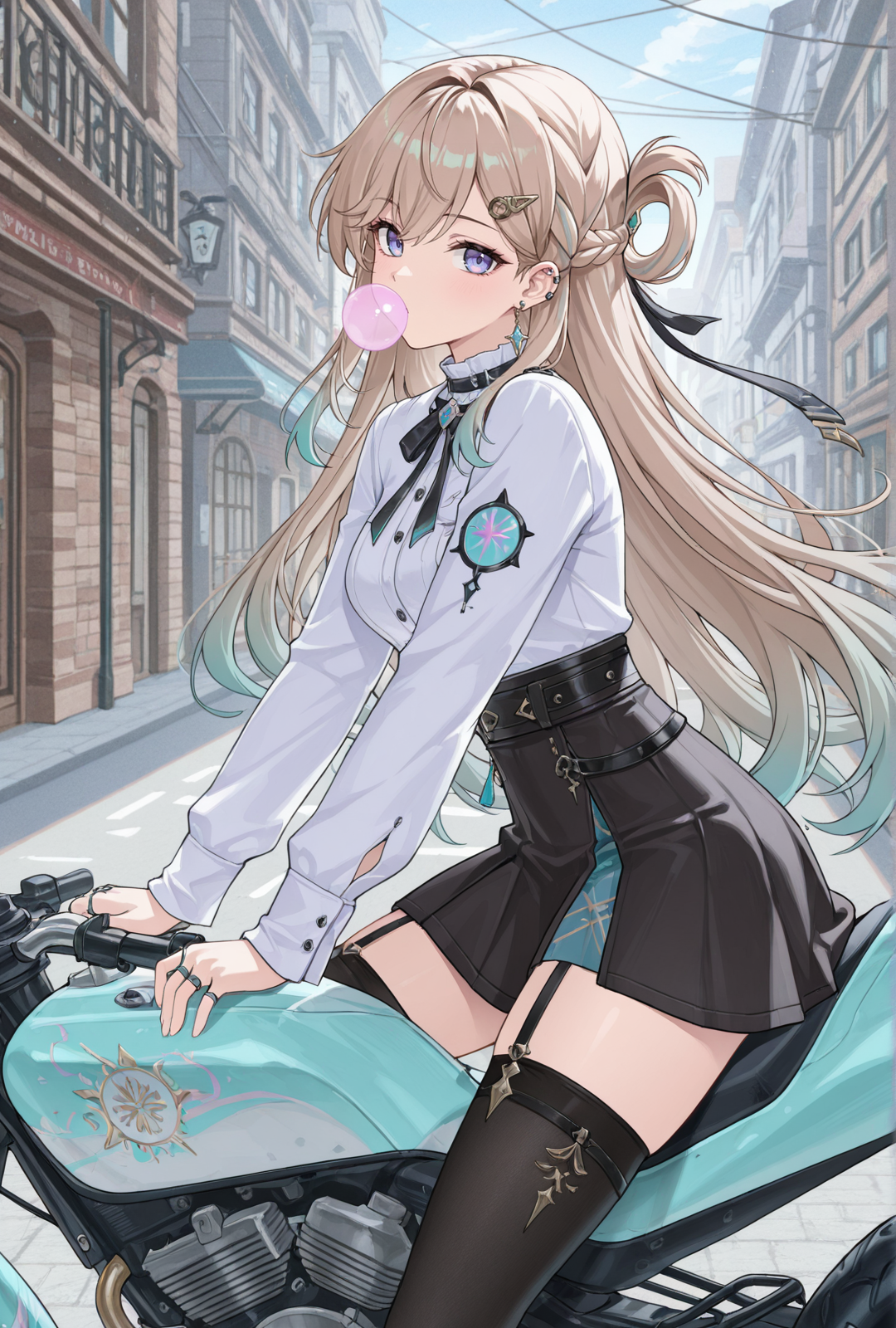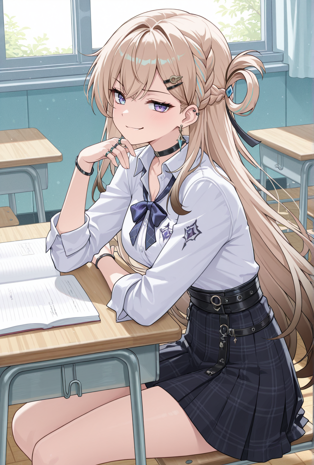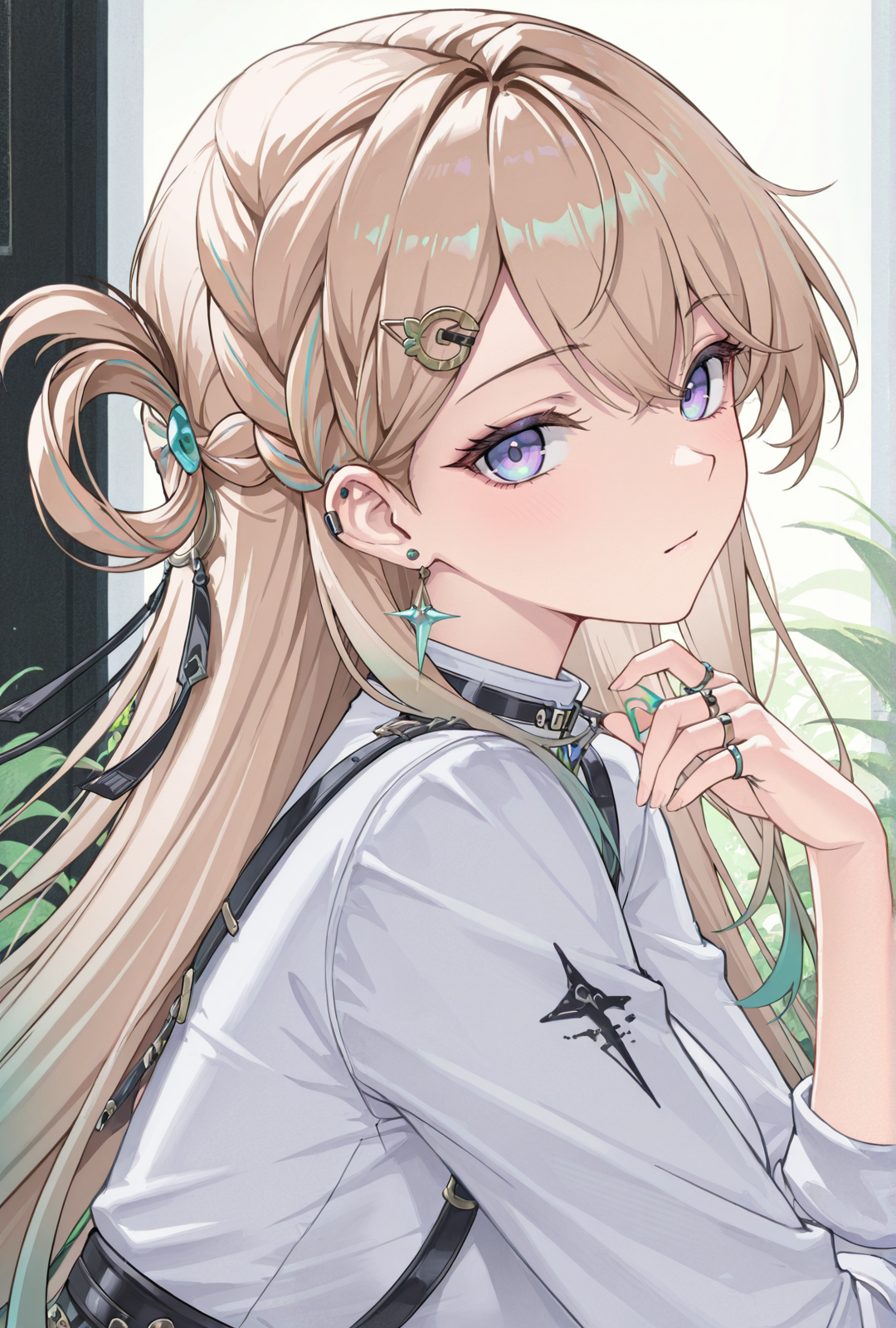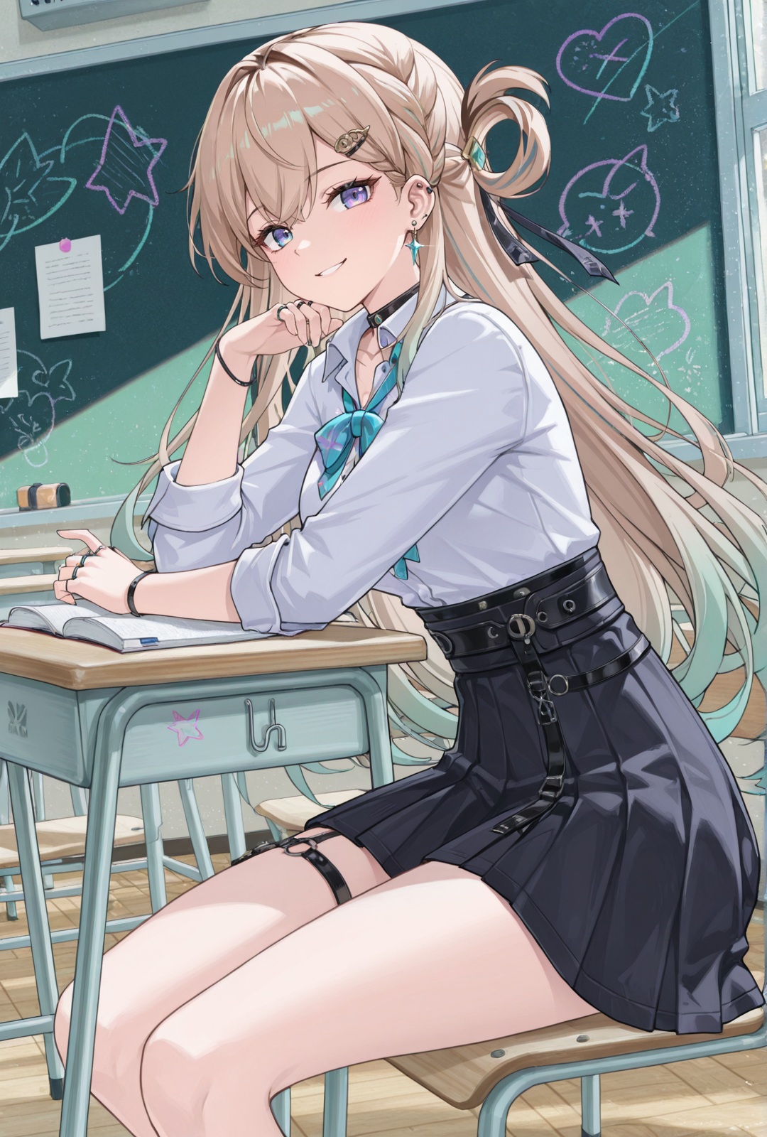 | 학습된 단어 | Lynae, 1girl, solo, long hair, blue eyes, purple eyes, multicolored hair, gradient hair, light brown hair, blonde hair, hair over one eye, half updo, hair rings복사됨! french braid, hair ornament, white shirt, earrings, pleated skirt, necktie, belt, black skirt, nail polish, bracelet, piercing, white jacket, ear piercing, sleeves rolled up, high-waist skirt, jacket on shoulders, green nails, aqua nails, hair ribbon, shirt tucked in, two-sided fabric복사됨! |