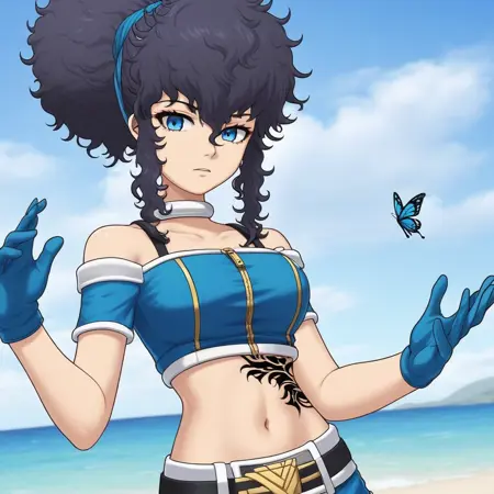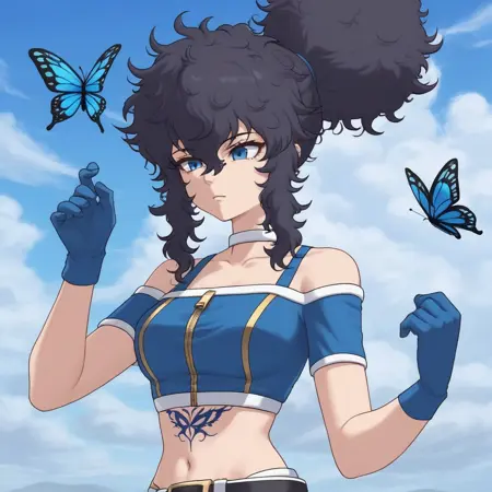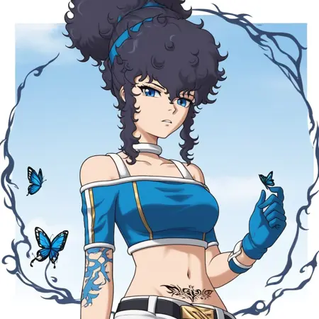 1girl, solo, dianakof, black hair, blue eyes, hair between eyes, sidelocks, wavy hair, hair bun, single hair bun, messy hair bun, bare shoulders, blue gloves, white choker, blue top, gold zipper, blue crop top overhang, black belt, blue dress, navel, exposed navel, butterfly tattoo, tattoo, navel tattoo,