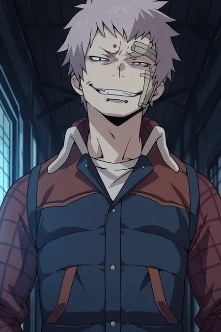 레이지 시라토리, 1남자, 혼자, 창백한 보라색 머리, 헝클어진 머리, 검은 눈, 얼굴 피어싱, 입술 피어싱, 눈썹 피어싱, 아랫입술 피어싱, 긴 소매, 빨간 체크 셔츠, 안에 흰 셔츠, 어깨가 빨간 진한 파란색 바디워머, 검은 슬림진, 검은 신발