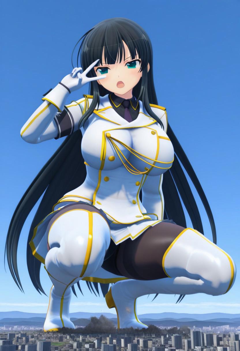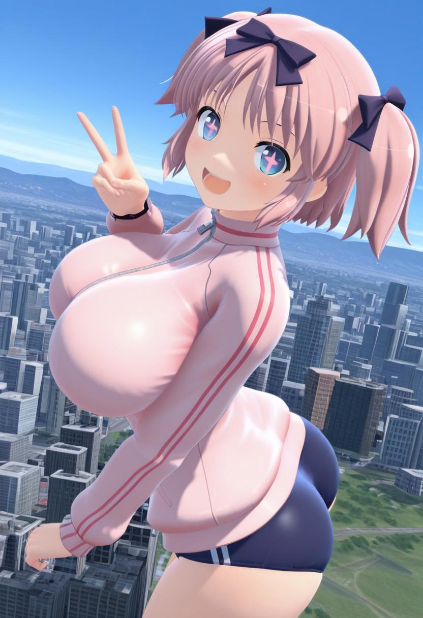 3D, plump, macro, giantess, building, landscape, blue sky, outdoors,
