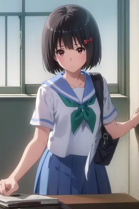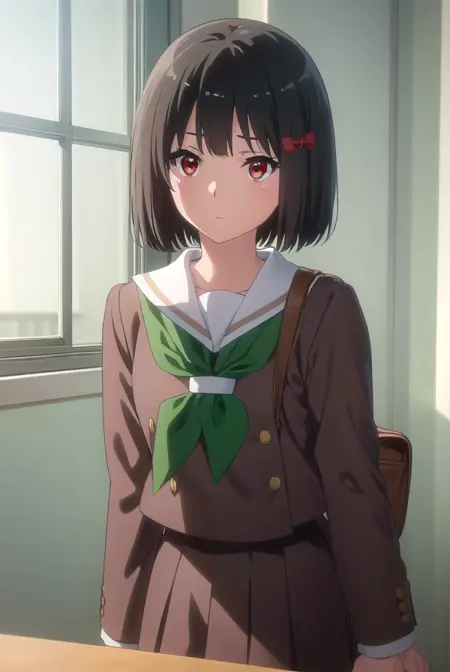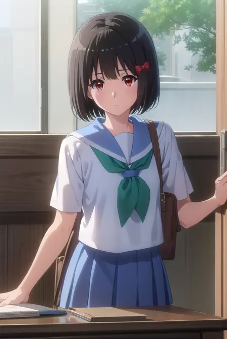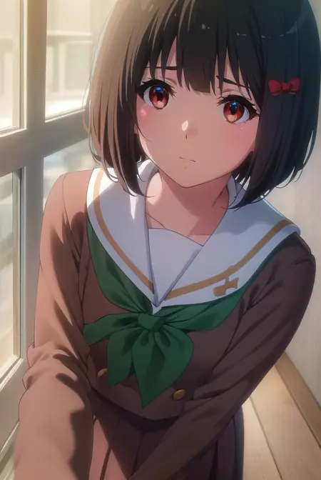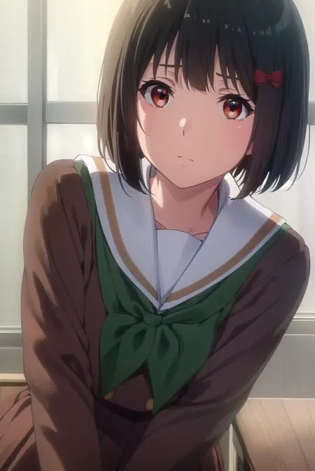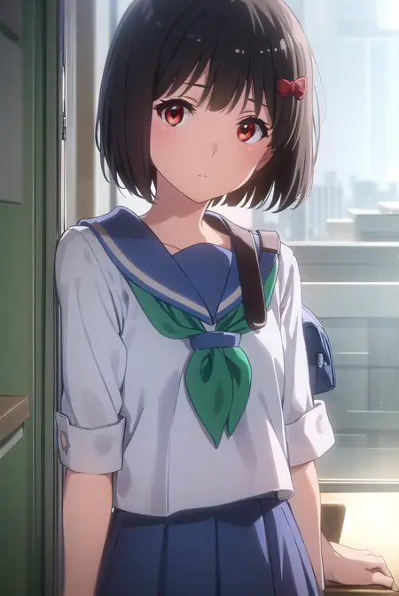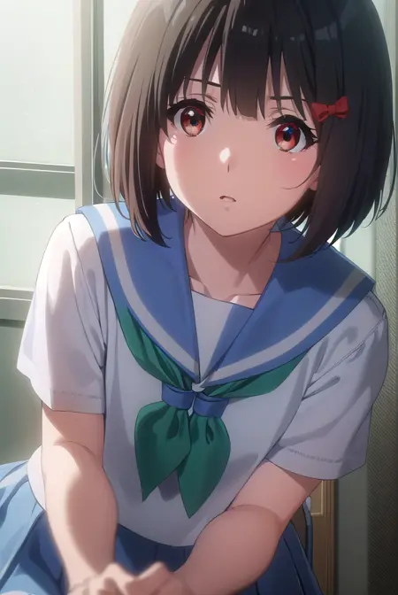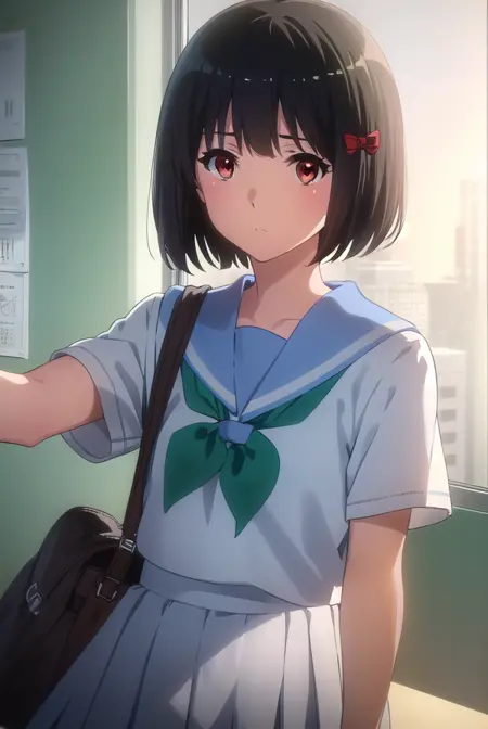 久石奏,短发,刘海,黑发,(红眼:1.3),蝴蝶结,发饰蝴蝶结,红色蝴蝶结,