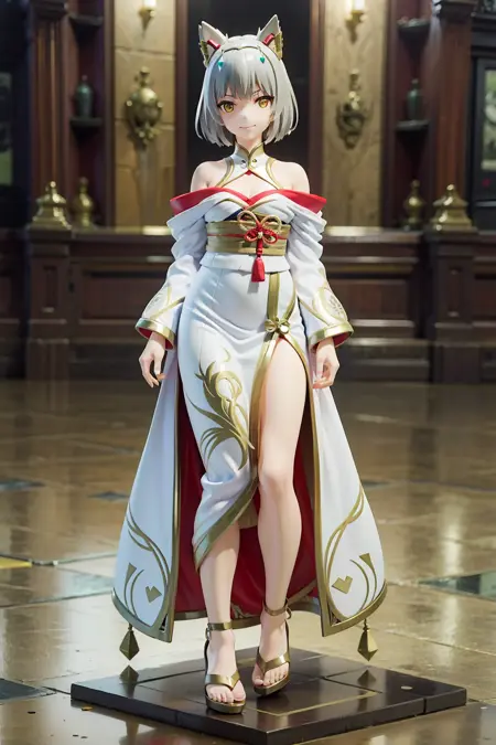 niaqueen,1girl,short hair,grey hair,blunt bangs,gold trim high cat ears,white facial mark,yellow eyes||black halterneck high collar,chest blue red jewel,gold trim flower print white kimono,small breasts,bare shoulders,long white wide sleeves,