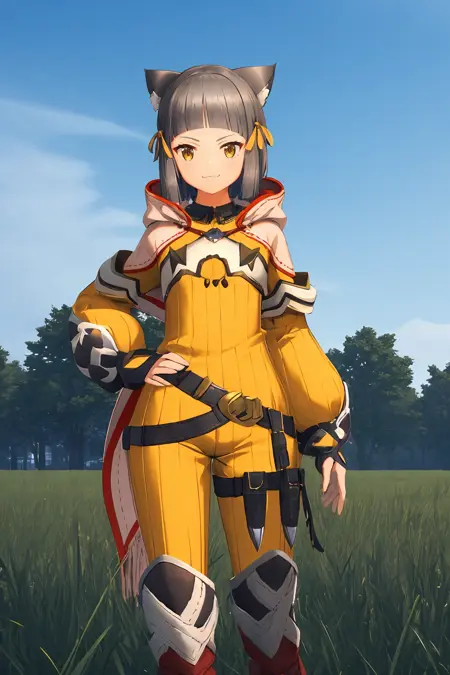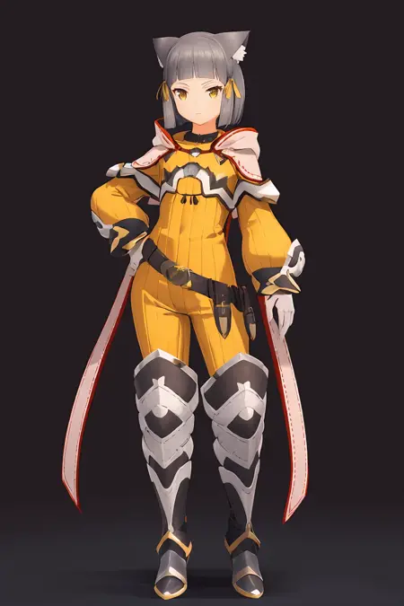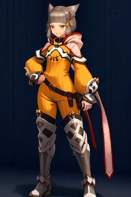 niadajia,1girl,solo,grey hair,short hair,blunt bangs,tips pointing backward cat ears,yellow head ribbon,white facial mark,yellow eyes||high-collared yellow bodysuit with white trim,pink hood with pairs of long ribbons,flat chest,hood down,black white gauntlets,metallic buckle belt,black white leg armor with red boots,