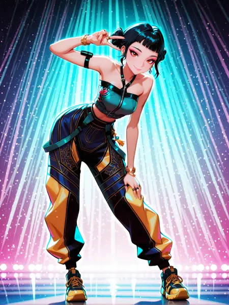 衣装のプロンプト:crop top, pants, baggy pants, earrings, single arm strap, bare shoulders, bracelet, midriff, ring, shoes, sneakers