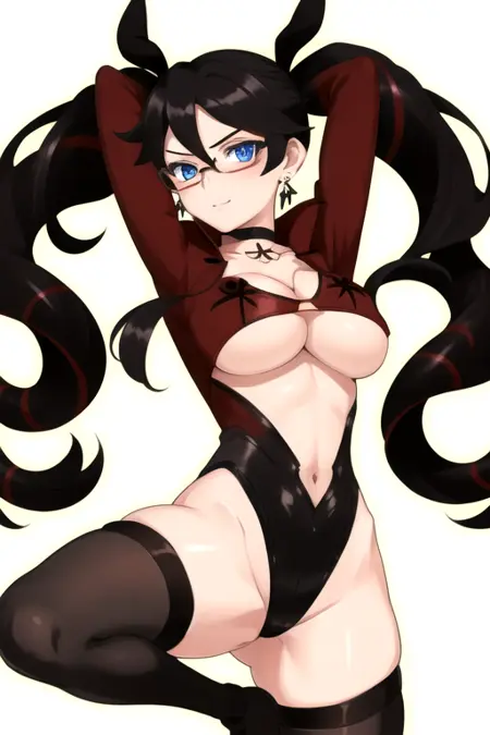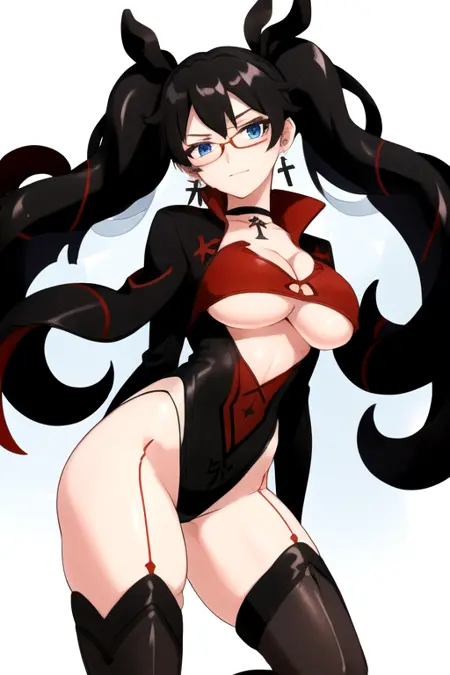 ToSAKA, 1girl, solo, long hair, blue eyes, large breasts, black hair, black thighhighs, cleavage, jewelry, twintails, earrings, red choker, glasses, black leotard, underboob, highleg leotard,