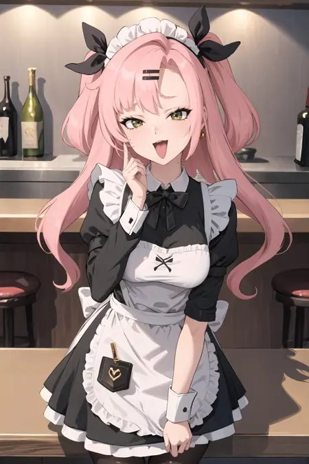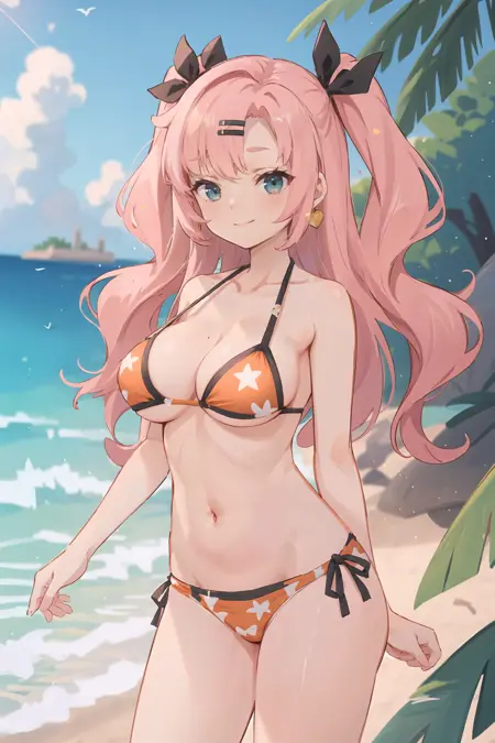 版本 2:针对其默认服装的附加提示词,可根据需要添加或删除:露脐上衣、单侧大腿袜、短裤、短款夹克、靴子配腰带、发带、发夹、两侧头发向上扎、耳环、单只袜子、高腰带、大腿绑带、可拆卸袖子、玩偶、黑色项圈