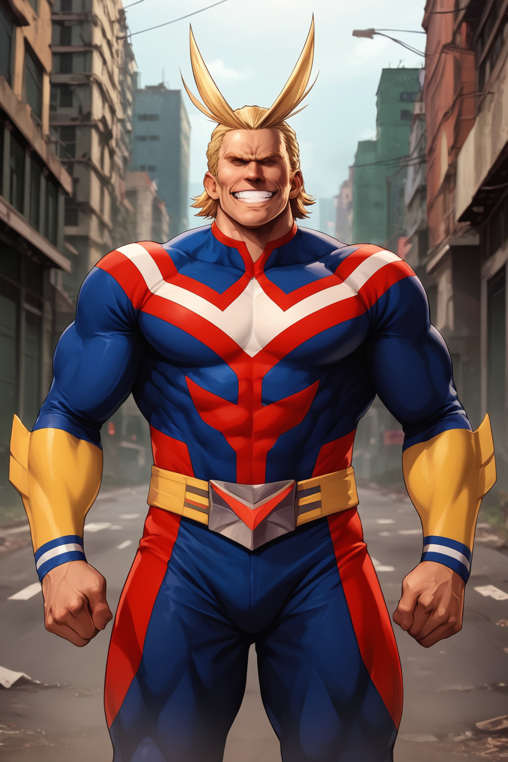 all-might,blonde hair,grin,antenna hair, shadow eyes, dark eyes, shaded_eyes, shadow_over_eyes
