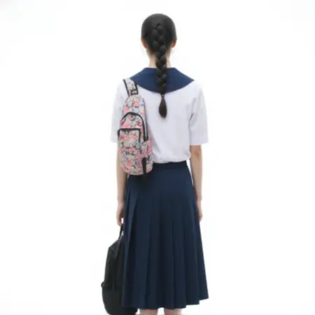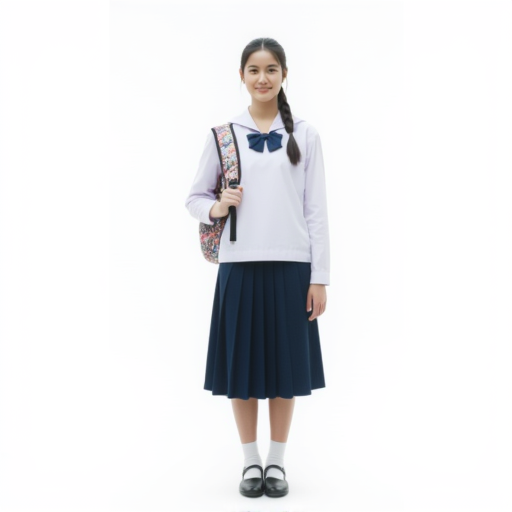 1. 制服: タイ中学校制服白いミディブラウス出しているネイビーブルーのセーラー襟ネイビーブルーのプリーツスカートなどのプロンプトを使用。