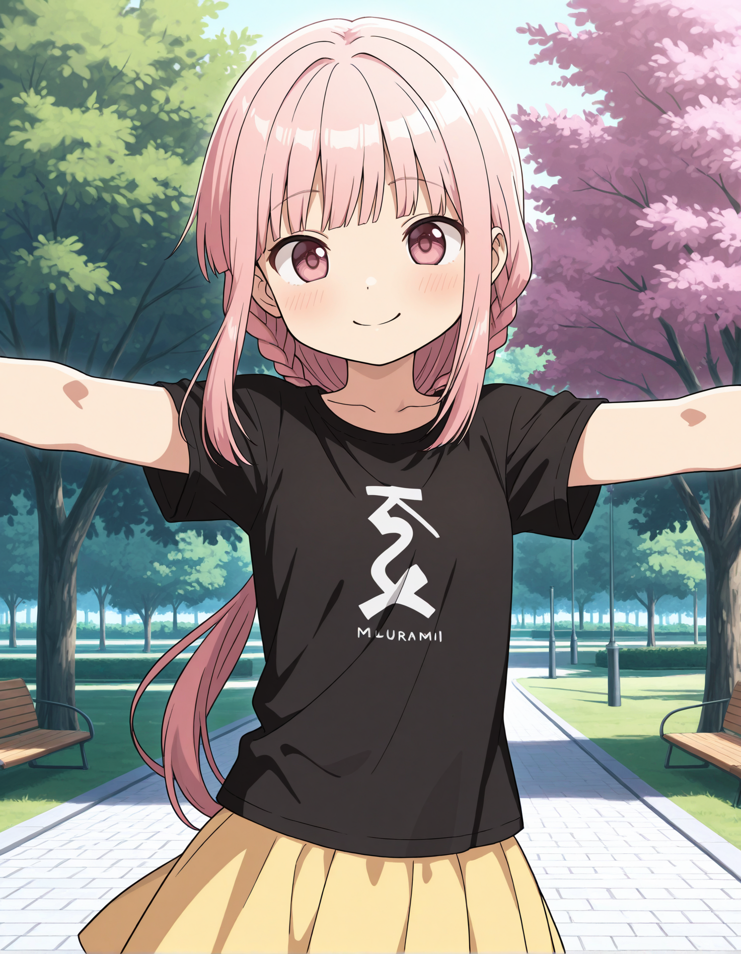 외모: 분홍색 머리, 옆머리 땋기, 낮은 토끼 꼬리, 분홍색 눈