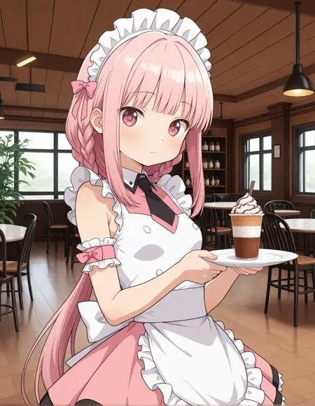 메이드 복장: mgrcirohatamaki, irhmai, 메이드 헤어 액세서리, 분홍색 머리 리본, 흰색 칼라, 검은색 넥타이, 분홍색 소매 없는 드레스, 흰색 앞치마, 분홍색 팔찌, 흰색 뒷리본, 흰색 프릴, 흰색 허벅지 스타킹