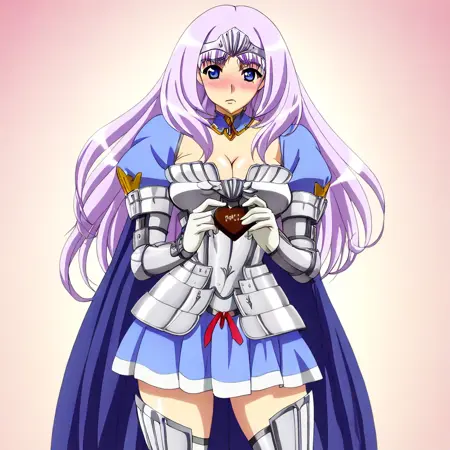 annelotte \(queen's blade\), lavender hair, long hair, bangs, sidelocks, blue eyes, tiara, armor, armored dress, blue cape, skirt, gloves, armored thighhighs, heels, cleavage, large breasts, 1girl, solo