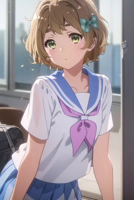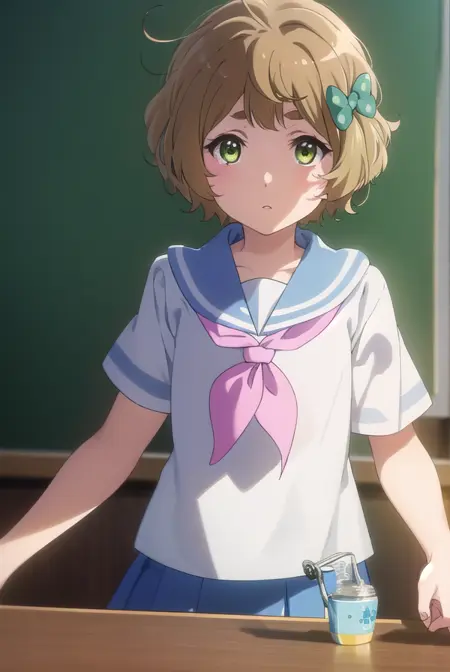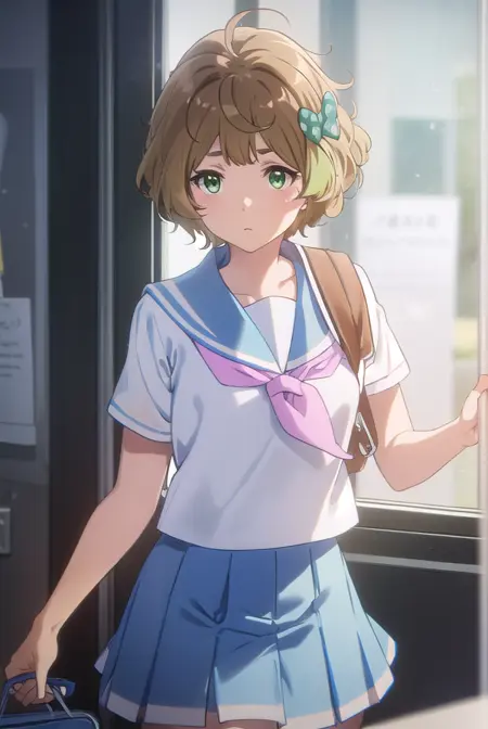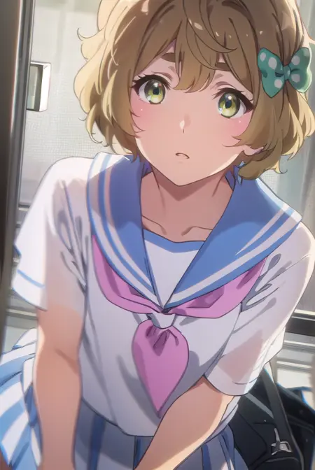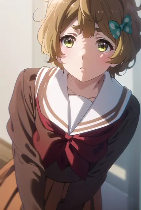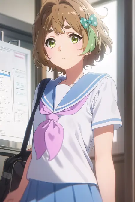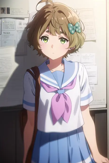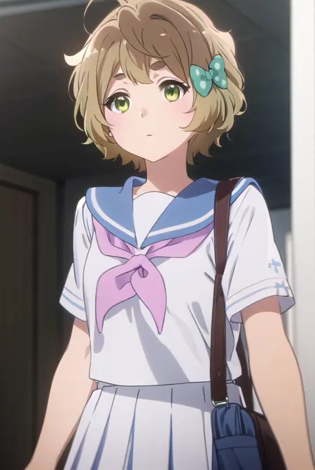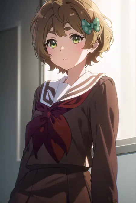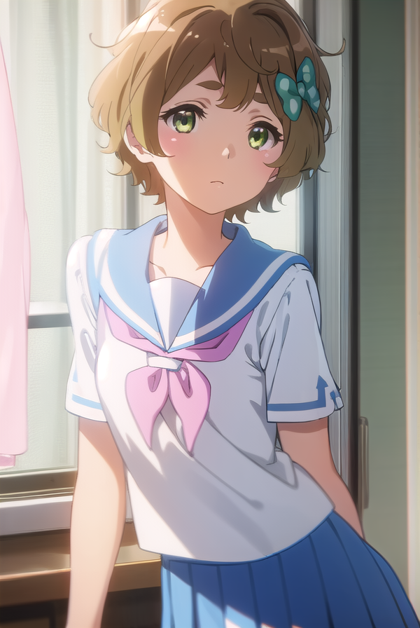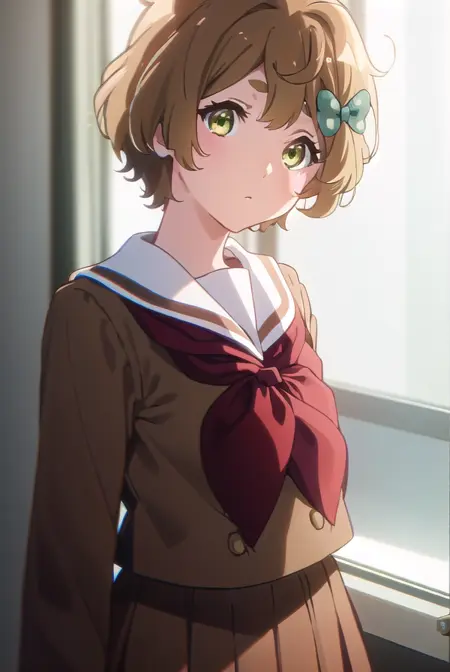 sapphire kawashima,短发,刘海,棕色头发,(绿色眼睛:1.3),蝴蝶结,呆毛,发带,波点,波点蝴蝶结,