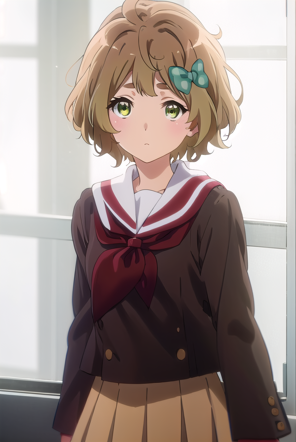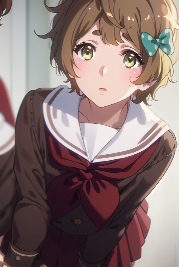 裙子,衬衫,长袖,校服,百褶裙,serafuku,领结,(棕色裙子:1.2),白色水手领,(棕色衬衫:1.2),鬼冢高校校服,(红色领结:1.5),