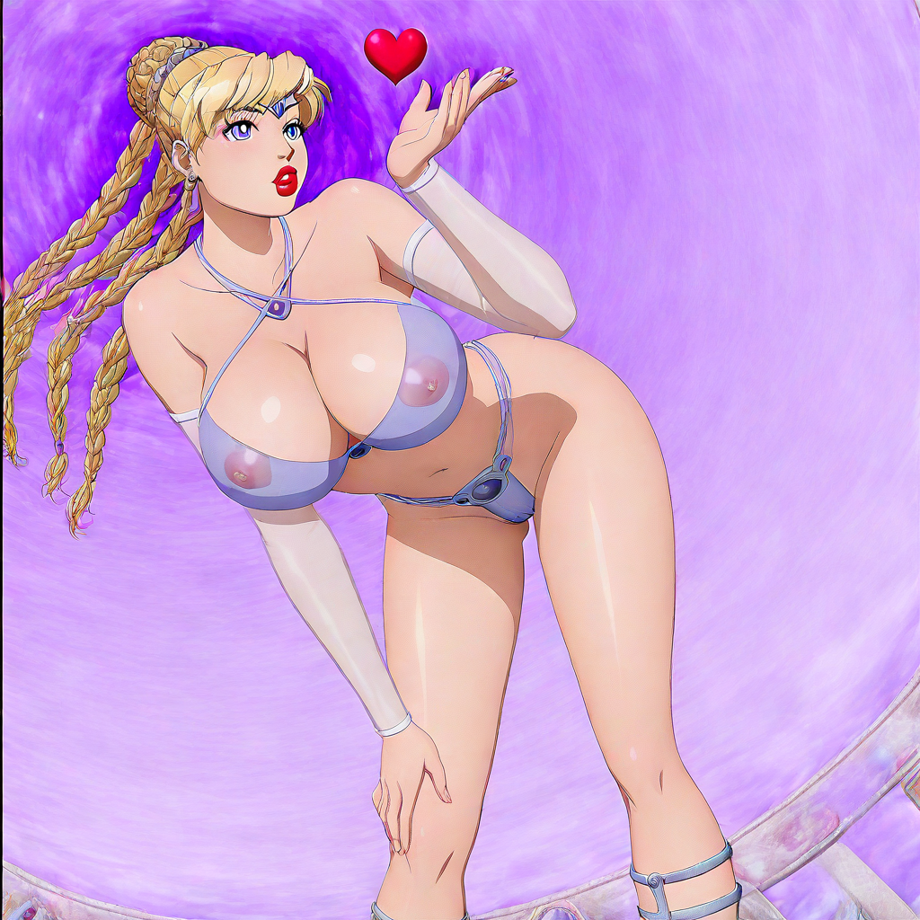 freya \(danger babe\), blonde hair, long hair, braided ponytails, hair bun, blue eyes, red lipstick, tiara, jewelry, see-through bikini, halterneck bikini, metal thong, see-through sleeves, heels, cleavage, large breasts, 1girl, solo