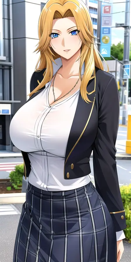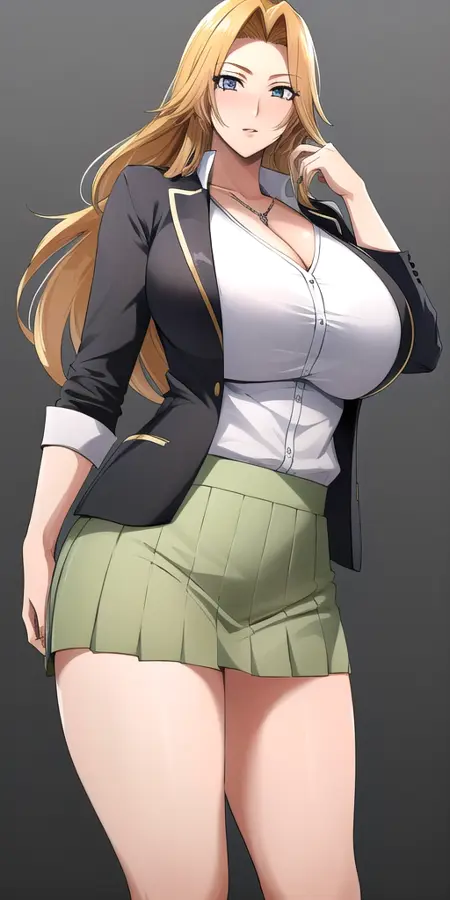 - School_Uniform_White_partially_unbuttoned_shirt_Grey_skirt_Short_sleeves_Cleavage:彼女の学校の制服。