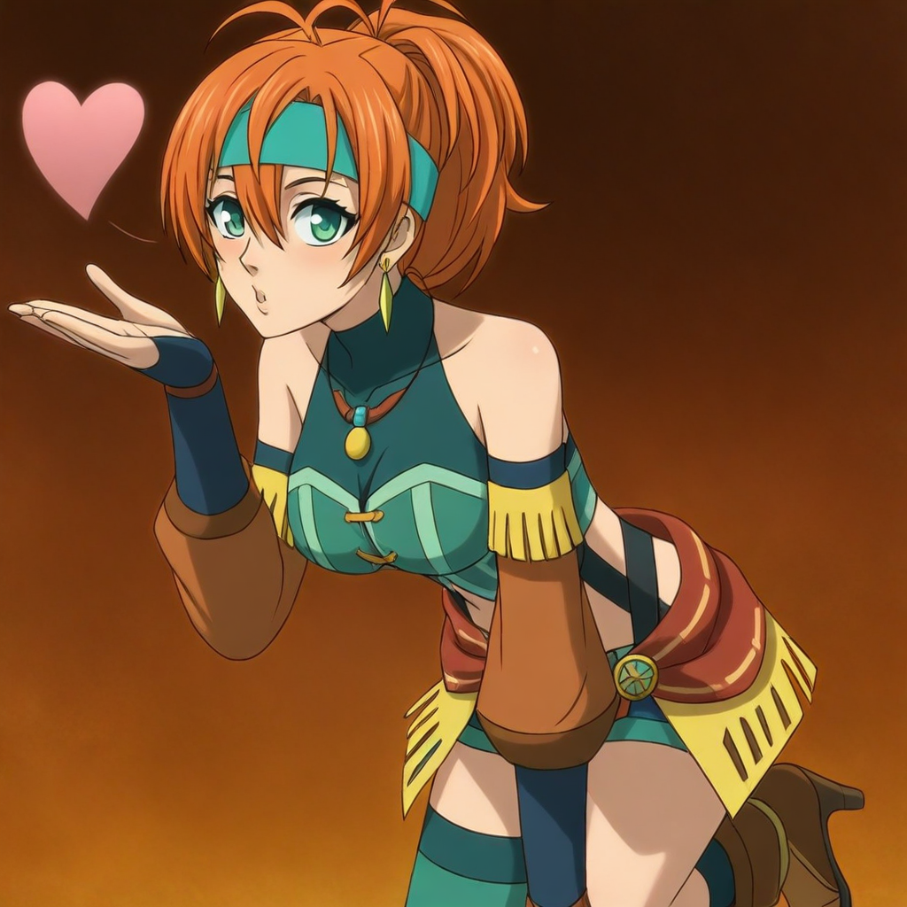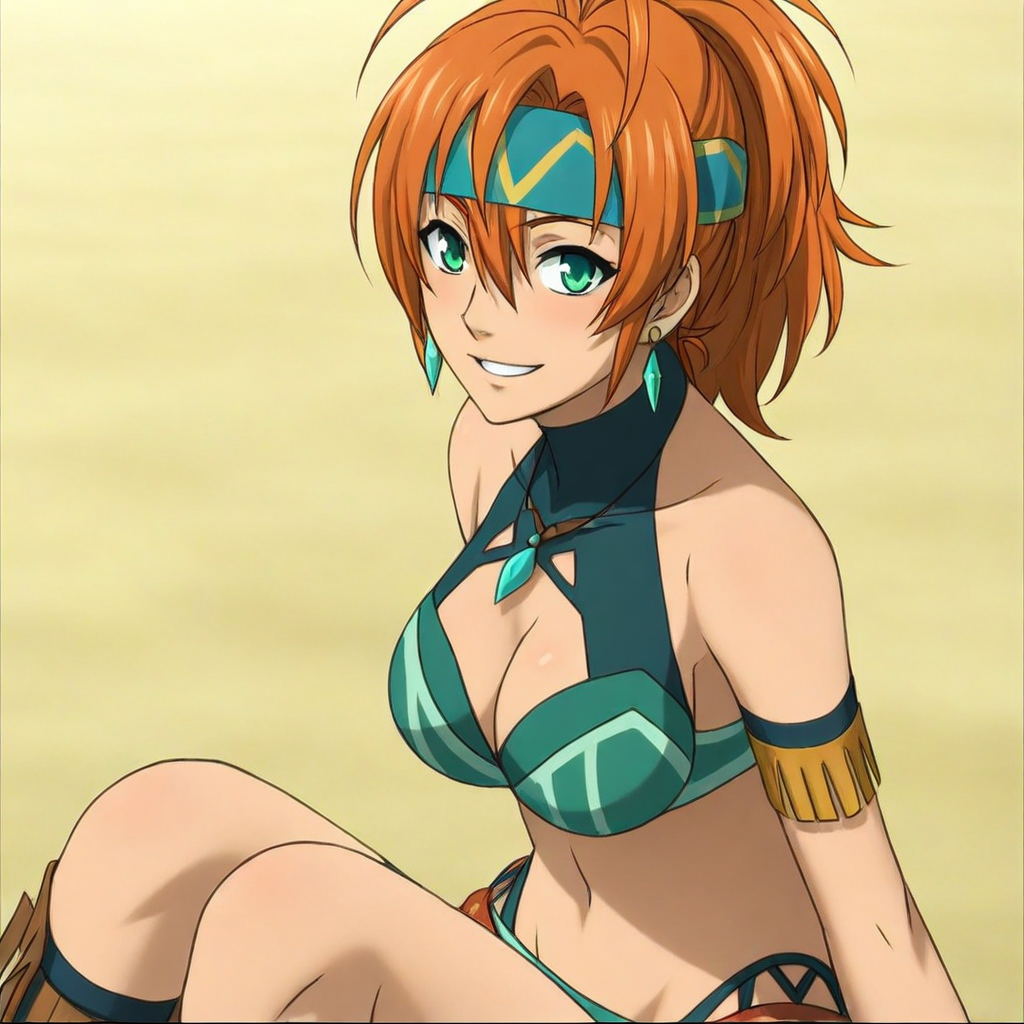 karna \(ys\), burnt orange hair, medium hair, short ponytail, antenna hair, green eyes, headband, earrings, jewelry, green crop top, revealing clothes, sash, shorts, skirt, detached sleeves, asymmetrical legwear, straps, socks, heels, large breasts, 1girl, solo