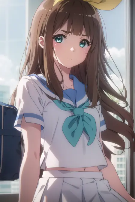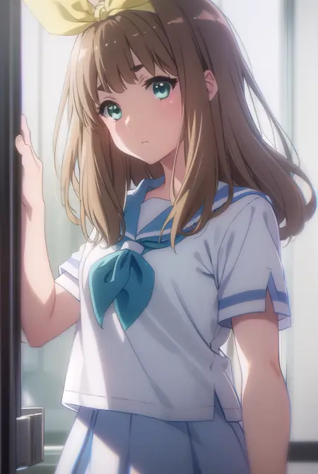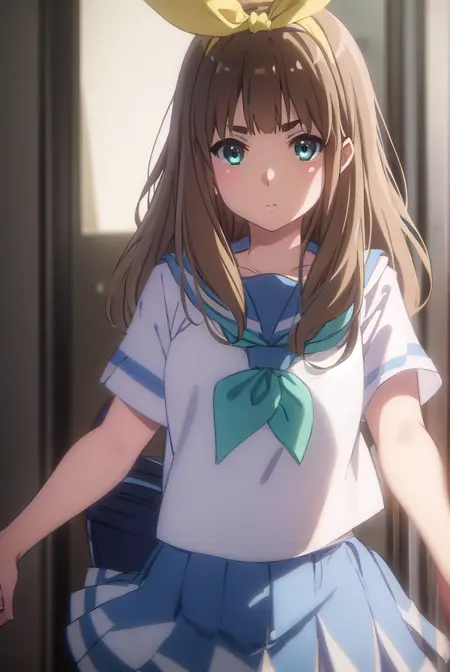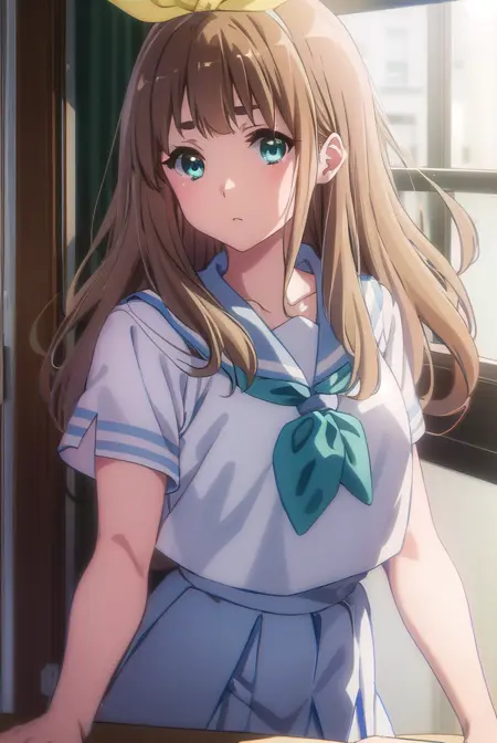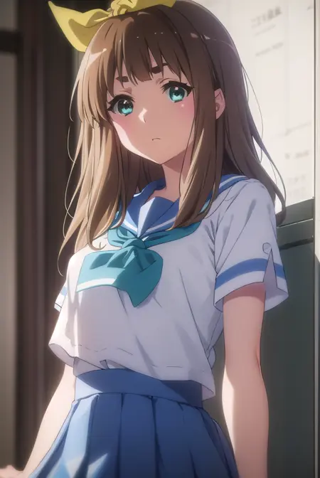 yuuko yoshikawa, long hair, brown hair, bow, ribbon, (green eyes:1.3), hair ribbon, yellow ribbon,