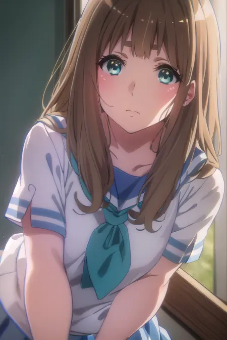 skirt, shirt, school uniform, white shirt, short sleeves, pleated skirt, serafuku, sailor collar, blue skirt, neckerchief, blue sailor collar, school bag, blue neckerchief, kitauji high school uniform,