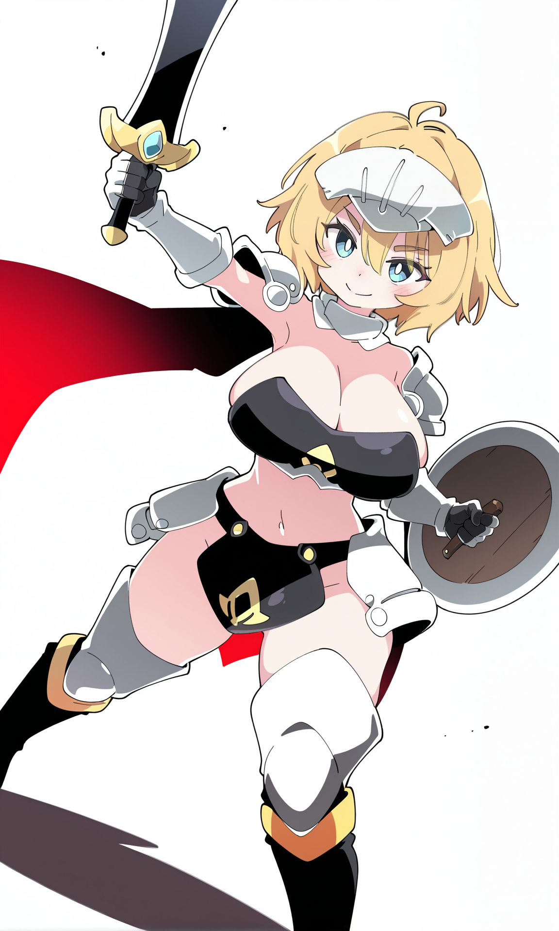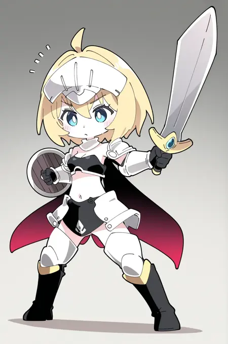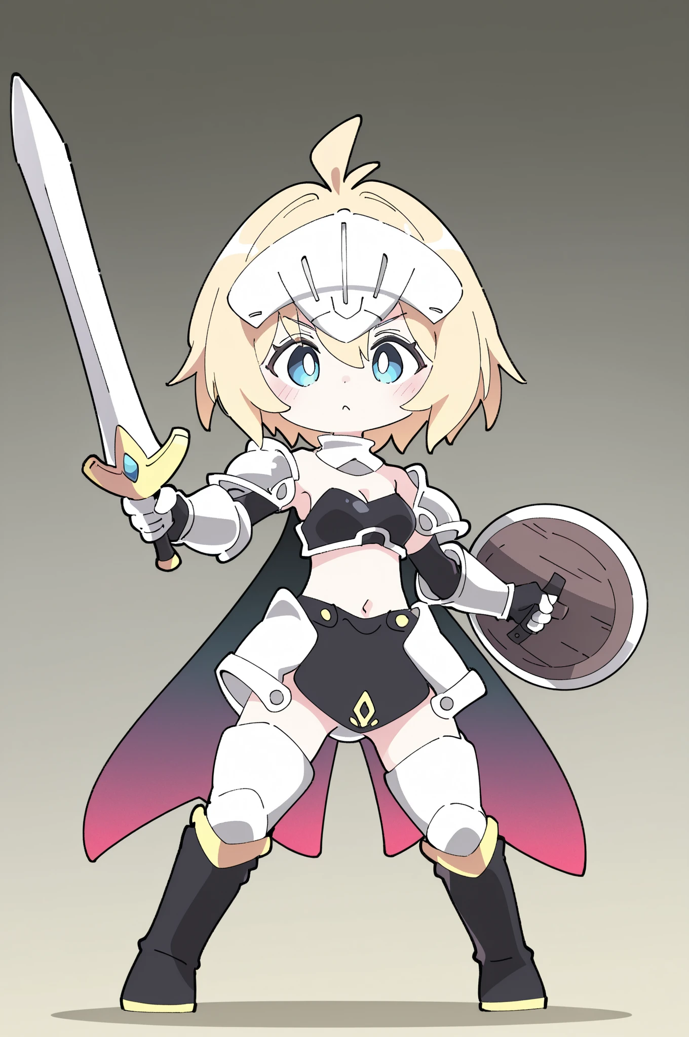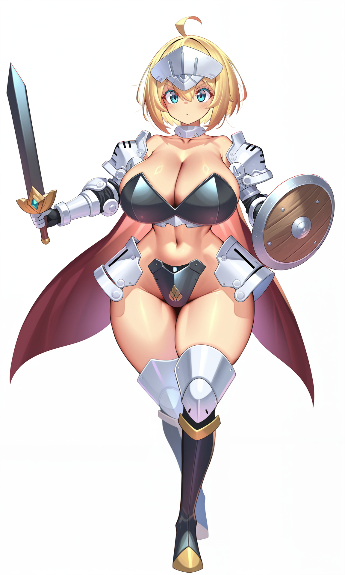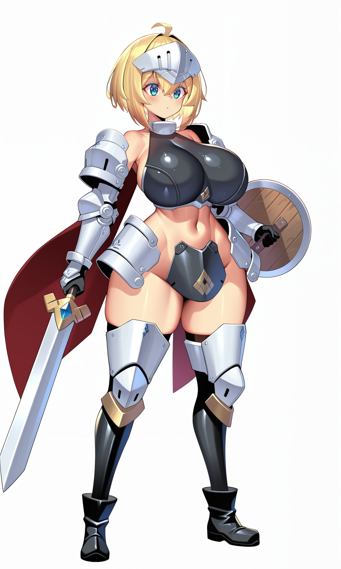 上身:white shoulder armor,midriff,white gorget,black breastplate,gradient cape,wing_cape,white gauntlets ,black_gloves,black_crotch_plate,white faulds,cleavage,