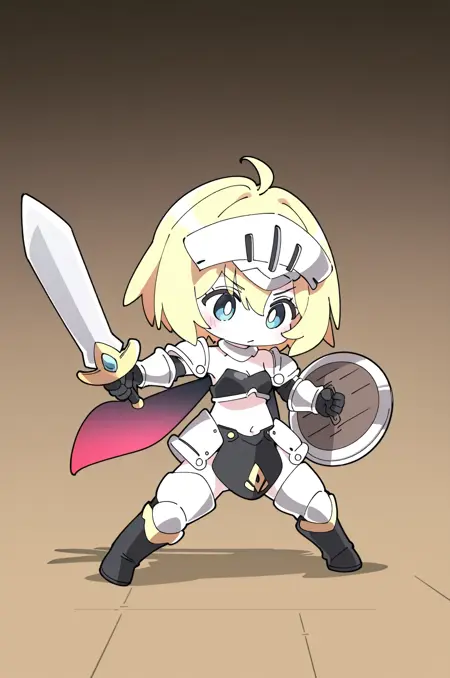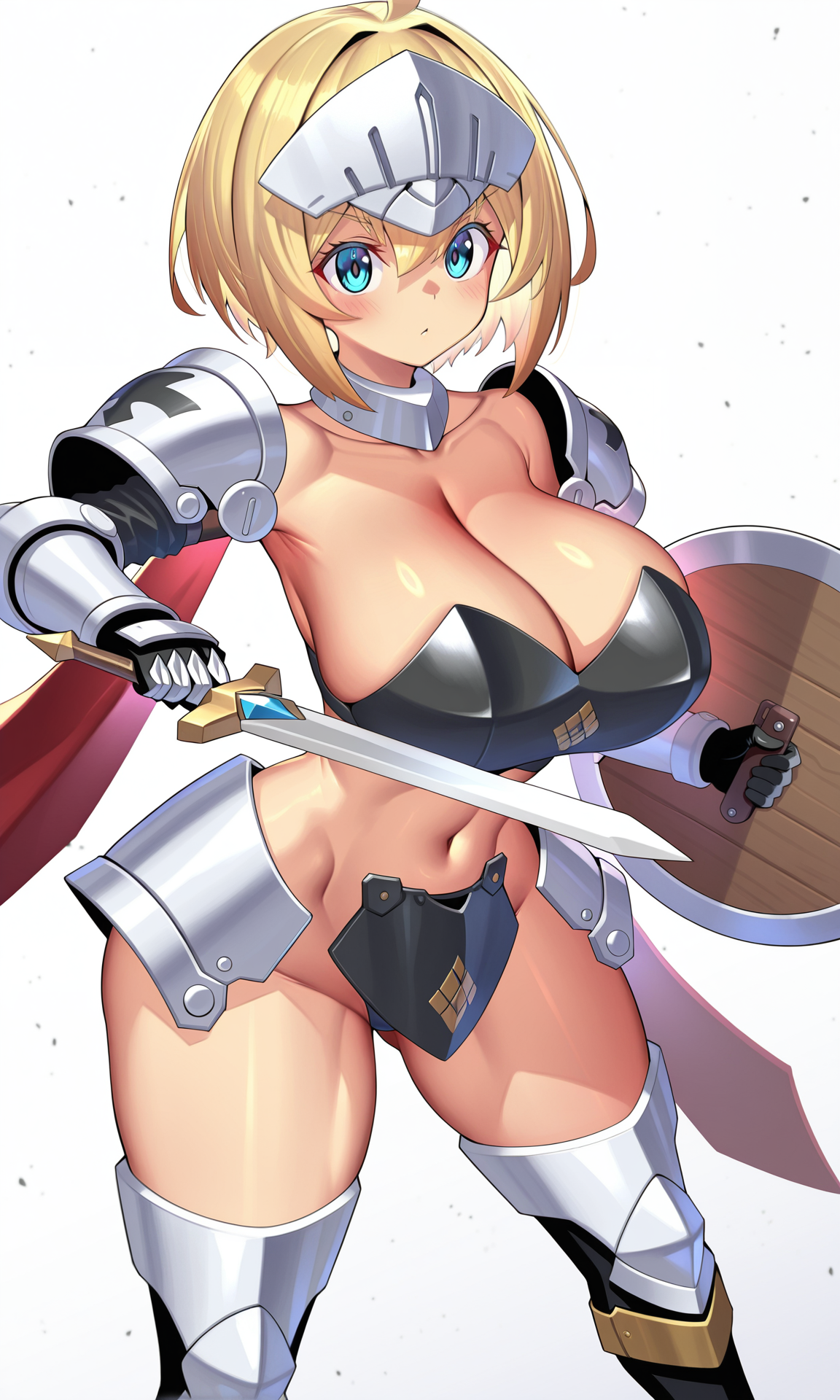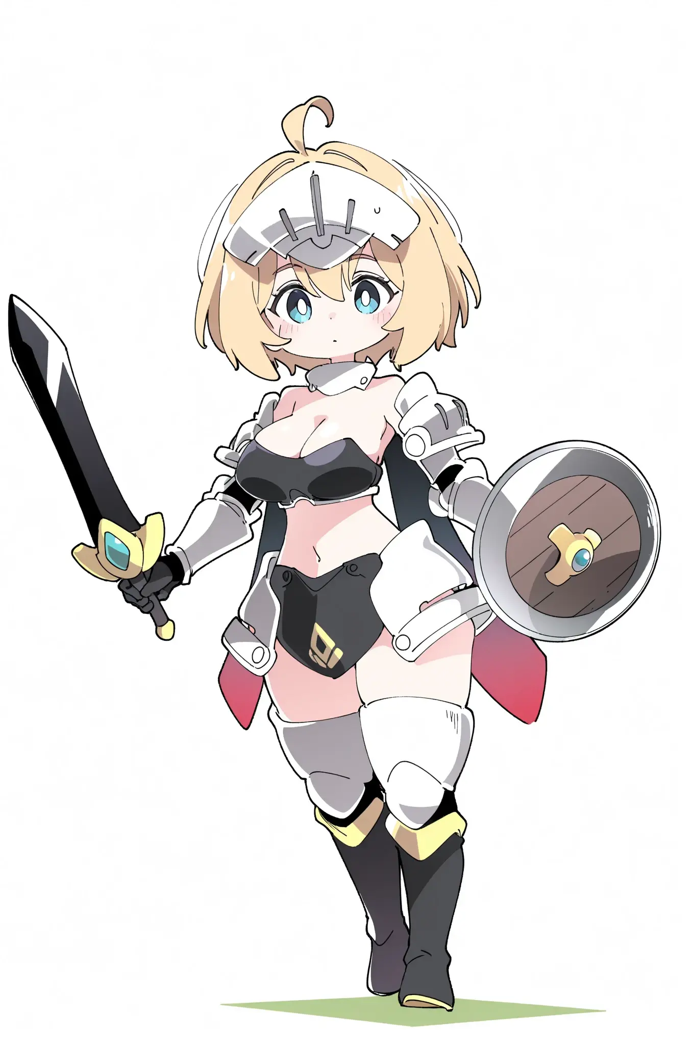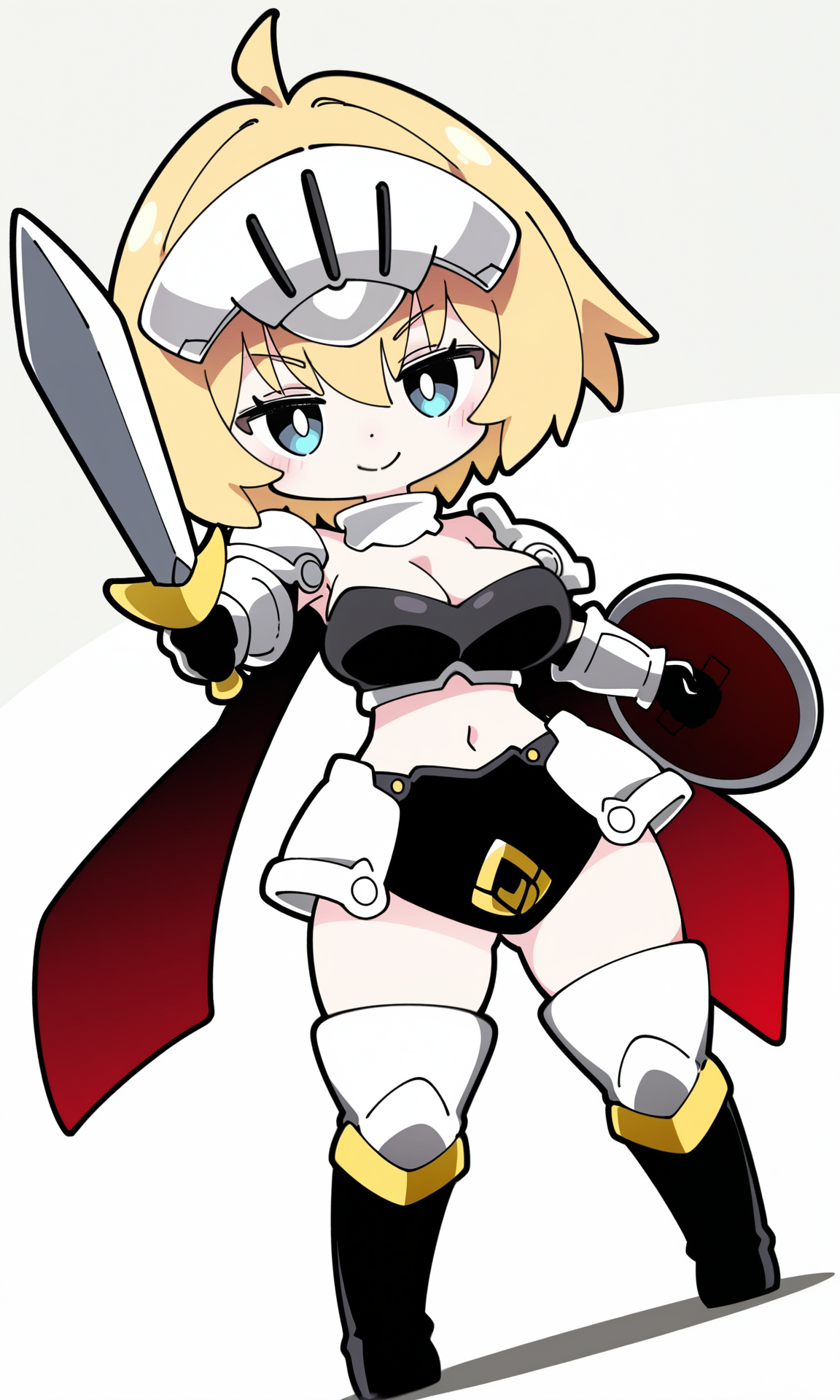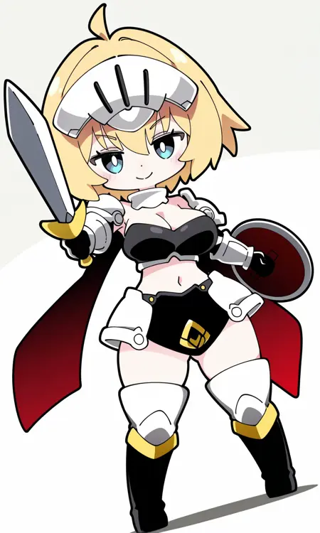 上身:white shoulder armor,midriff,white gorget,black breastplate,gradient cape,wing_cape,white gauntlets ,black_gloves,black_crotch_plate,white faulds,cleavage,