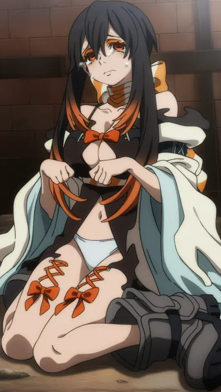 black dress, orange bow, grey boots, orange thigh ornaments, white and blue puffy sleeves, white panties, orange and white scarf, orange and white waistband, large breasts, navel, cleavage,