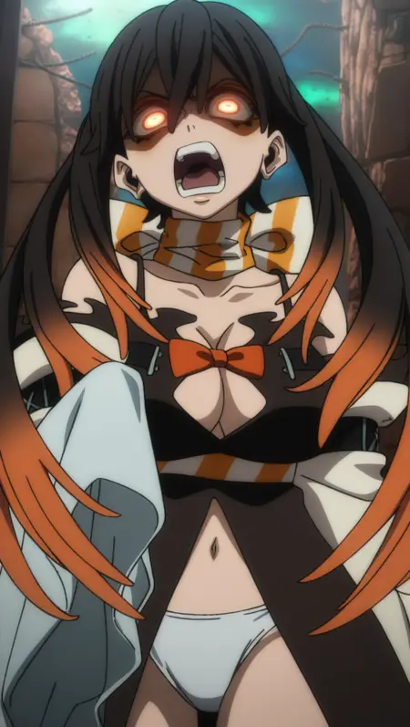 4m0, orange eyes, orange eyeshadow, orange and black hair,