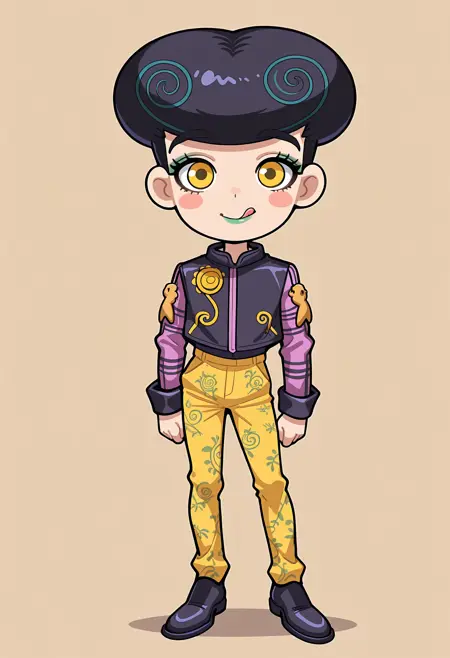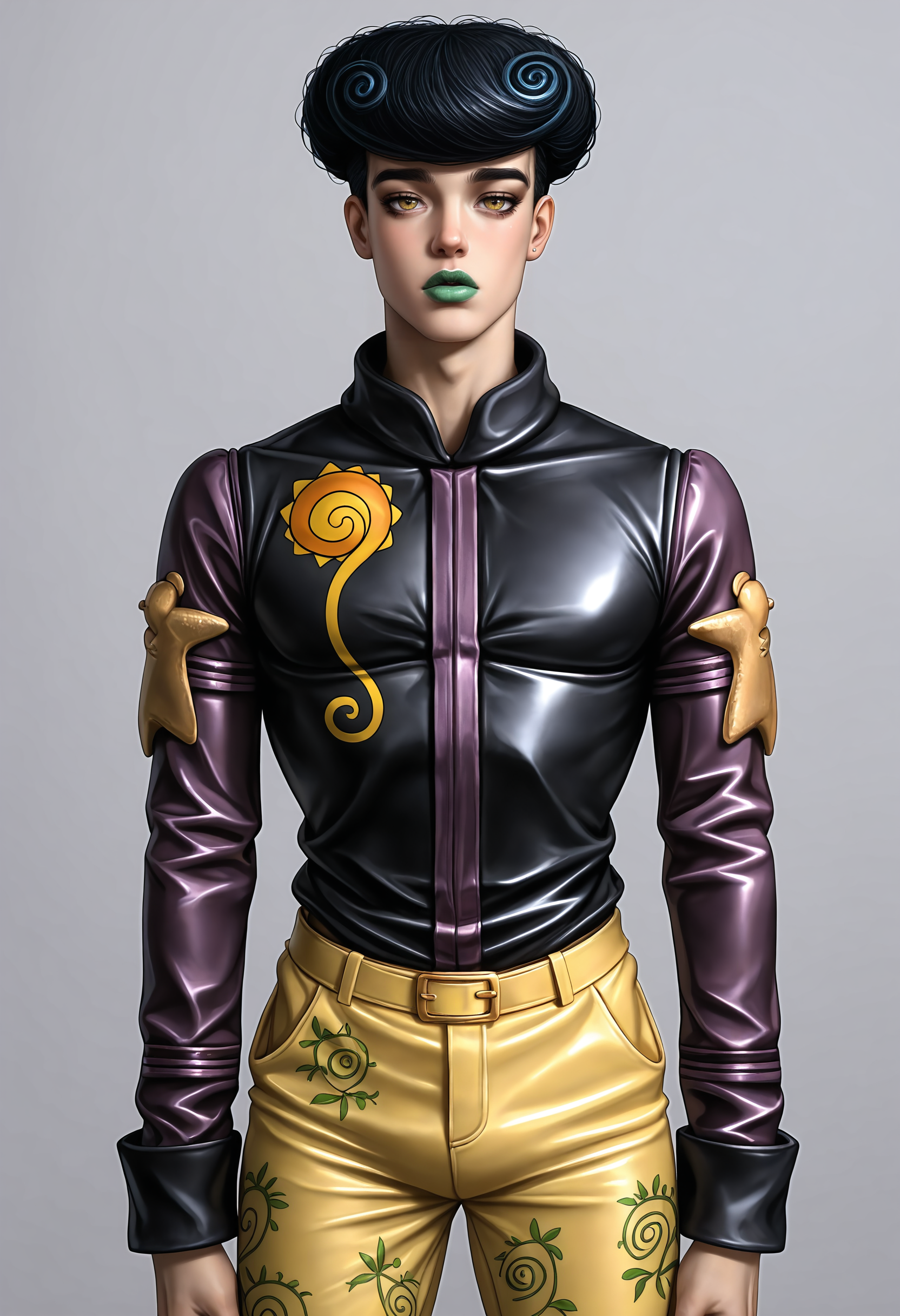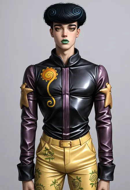 truilf, black hair, pompadour, yellow eyes, green lips, jacket, pants