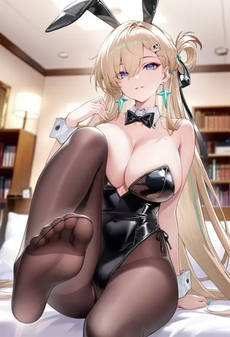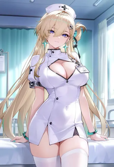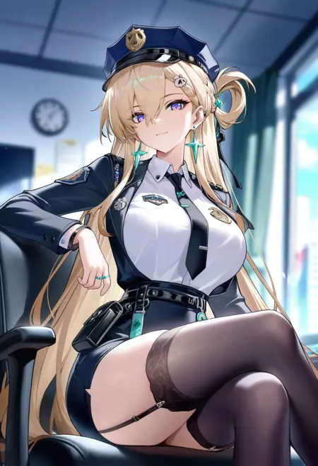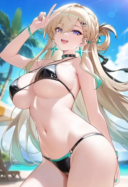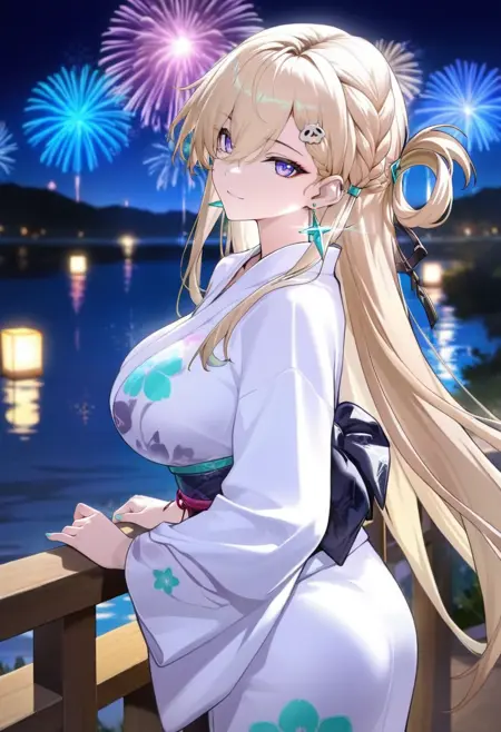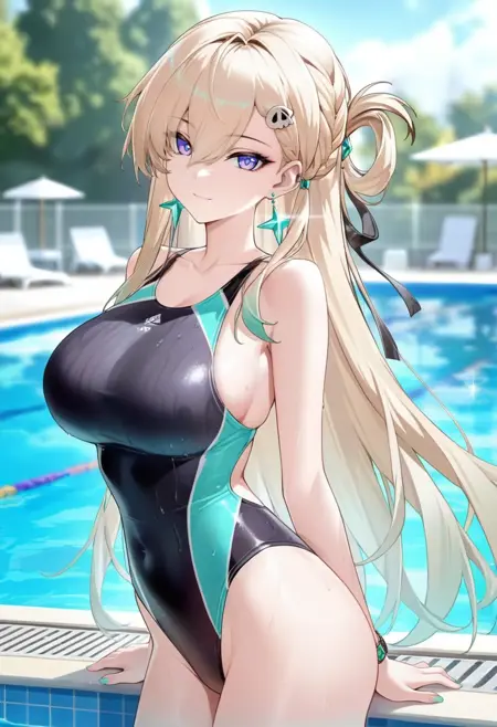 purple eyes, blonde hair, long hair, braid, hair rings, hairclip, aqua earrings