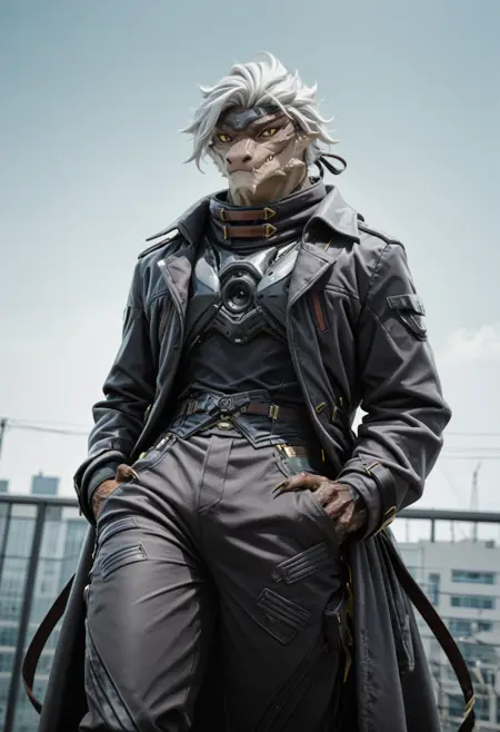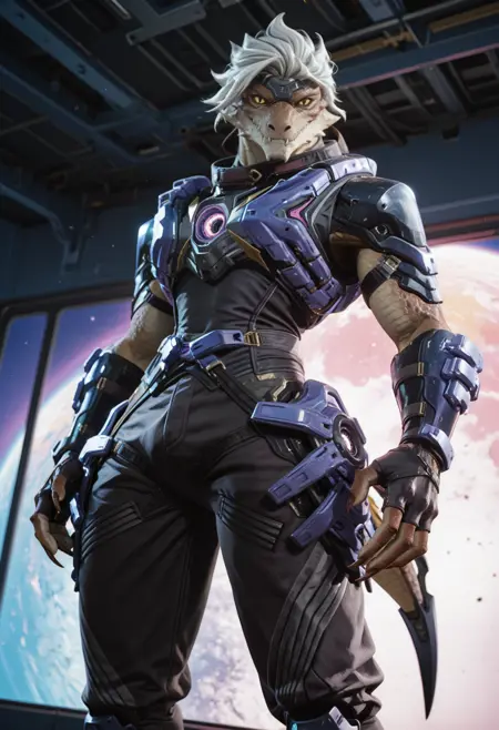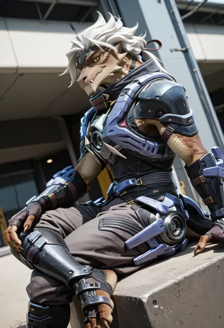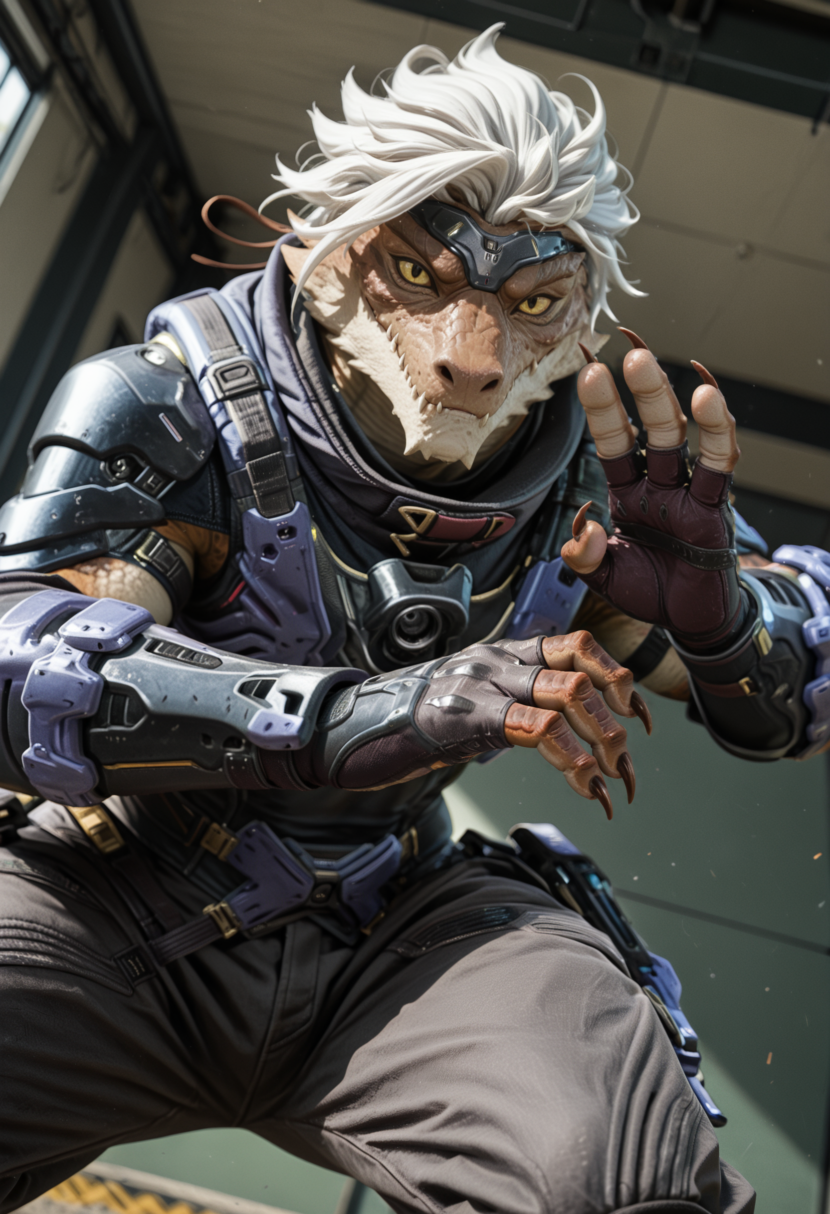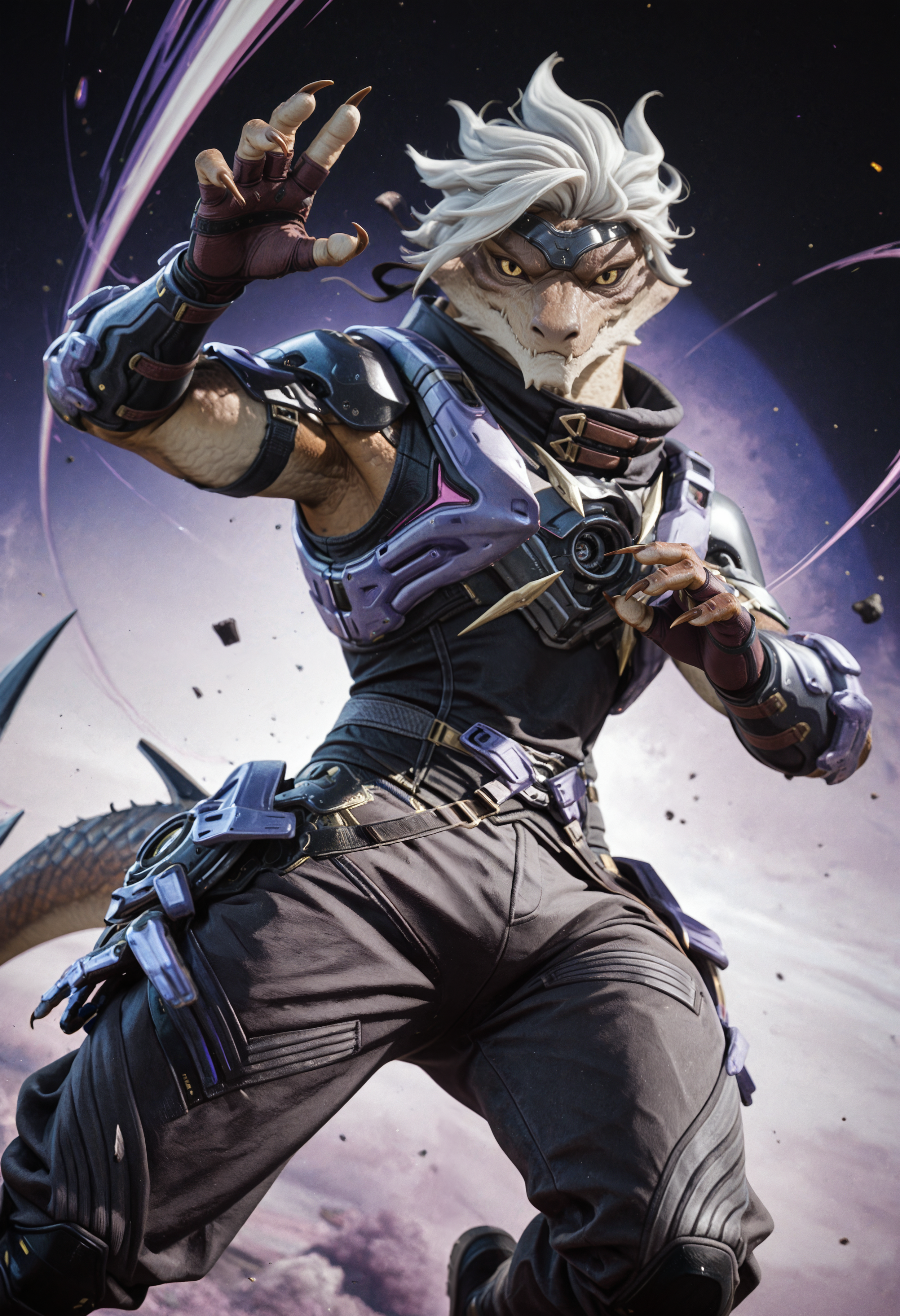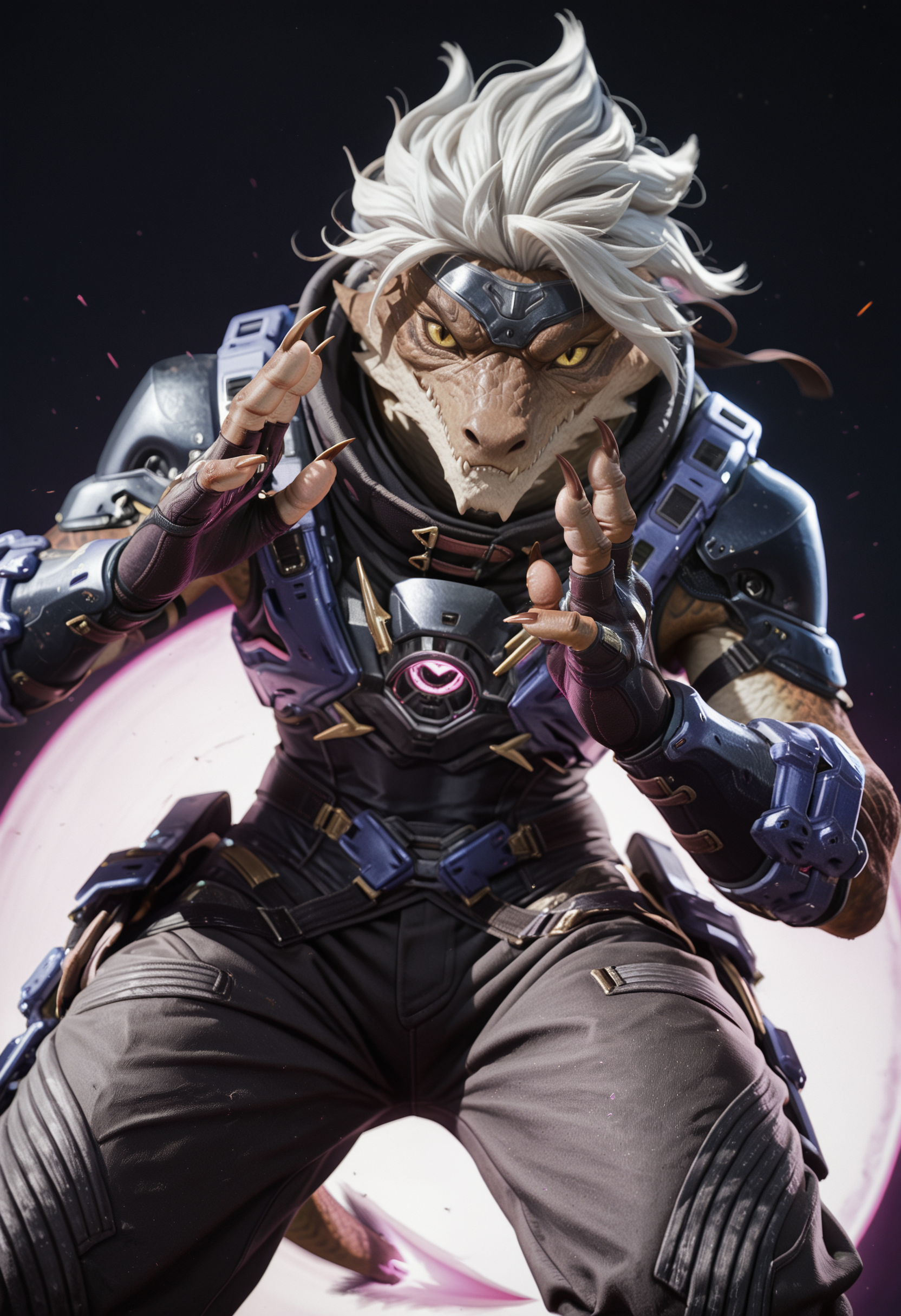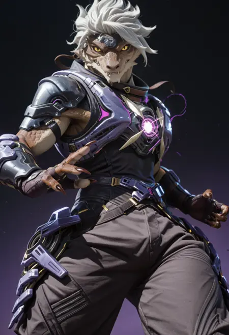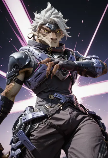 d3x_fr4g6unk, lizard, anthro, male focus, male, clothing, solo, 1boy, white hair, hi res, furry, armor, fingerless gloves, pants, furry male, yellow eyes, looking at viewer, claws, scalie, clothed, yellow sclera