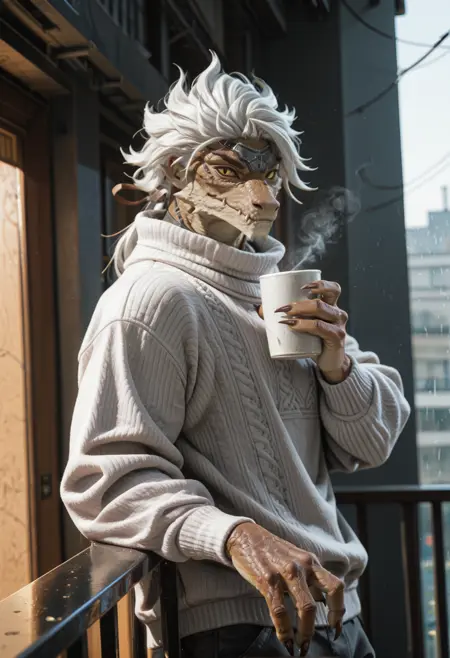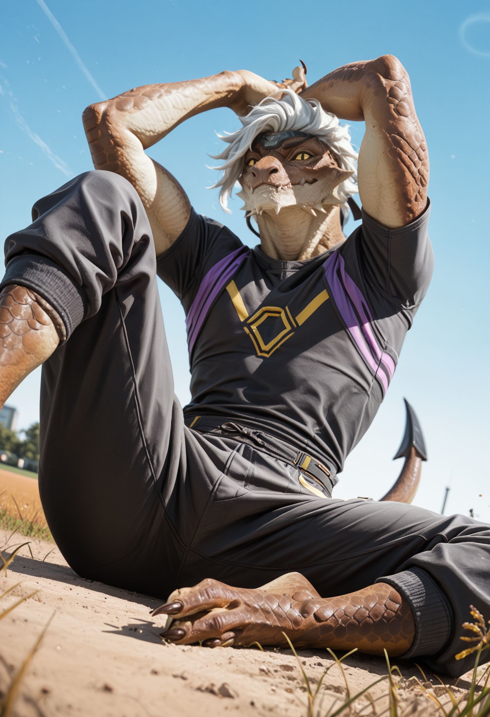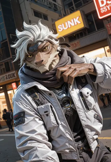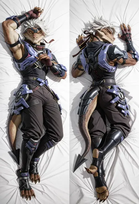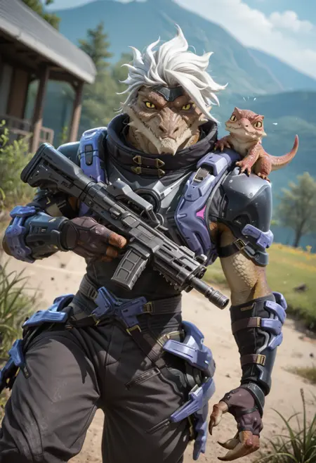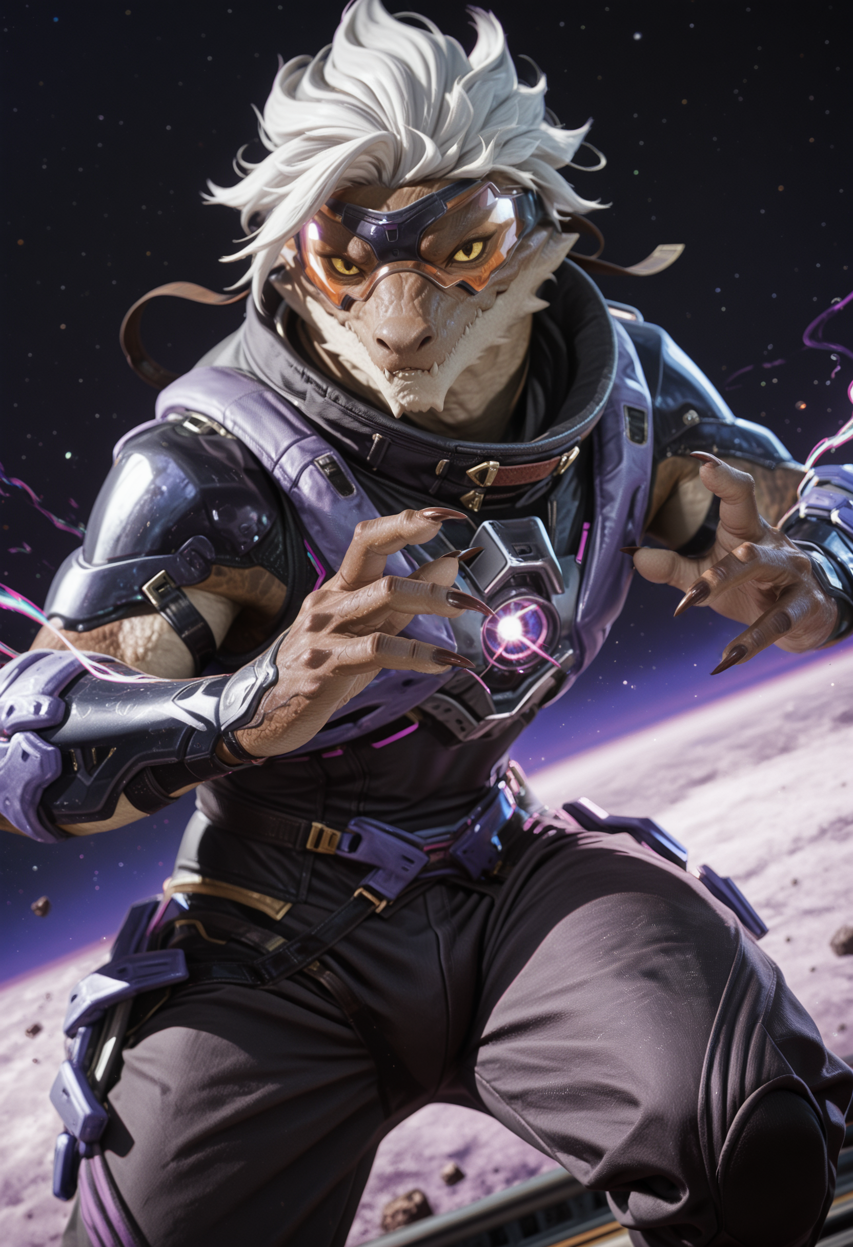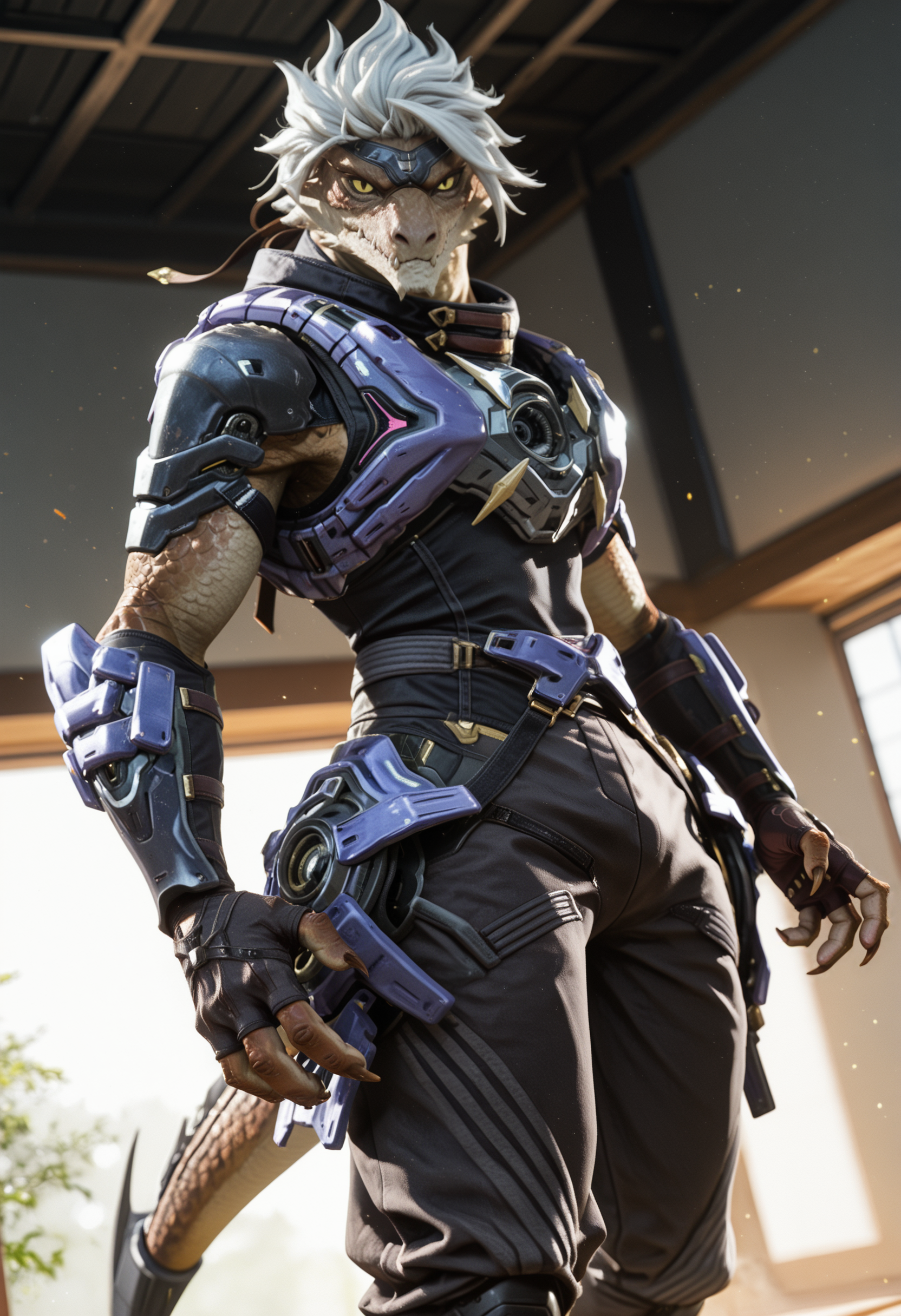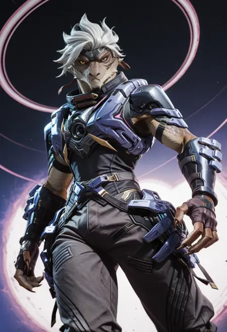 d3x_fr4g6unk, lizard, anthro, male focus, male, clothing, solo, 1boy, white hair, hi res, furry, armor, fingerless gloves, pants, furry male, yellow eyes, looking at viewer, claws, scalie, clothed, yellow sclera