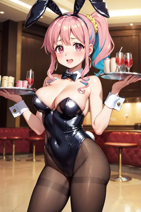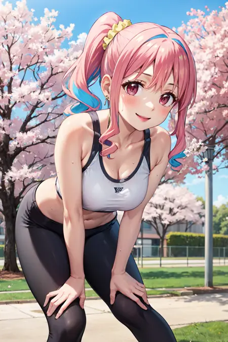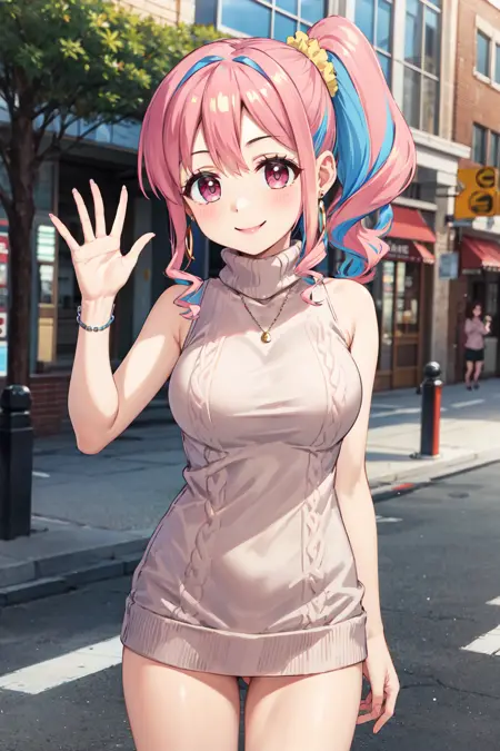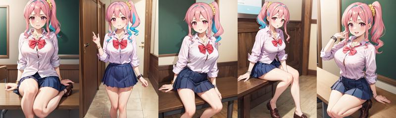 - aakaede、ツートンヘア、サイドポニーテール、サイドロックス、ヘアスクンチ、ギャル、イヤリング、ネックレス、胸、制服、赤いリボン、シャツ、ピンクのシャツ、長袖、ブレスレット、青いスカート、素足、茶色の靴